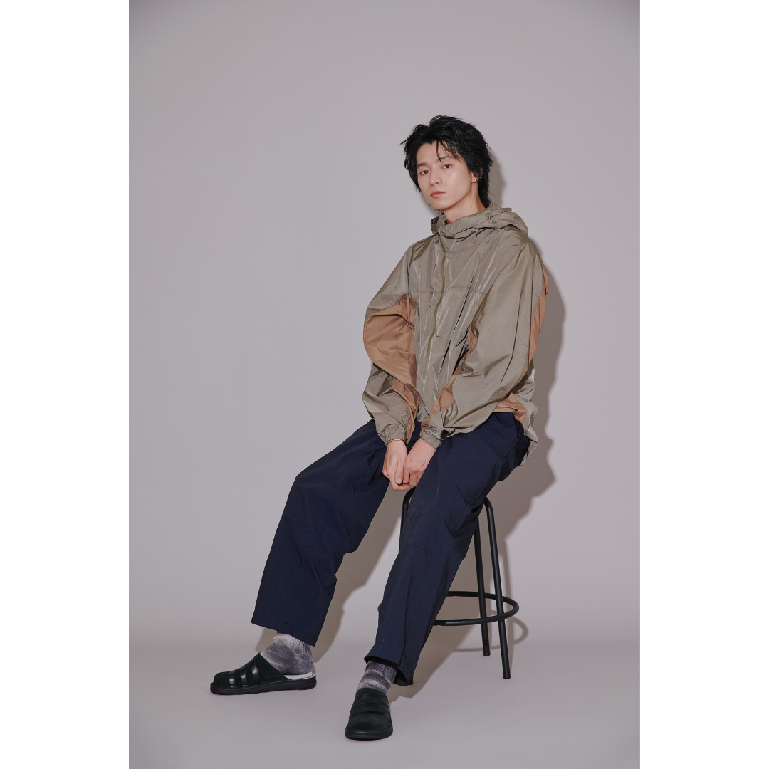 サンドウォーター(SandWaterr)のナイロンアウターは、異素材の切り替えやニュアンスのある配色が、どこか柔らかな雰囲気を演出してくれます。ボトムスには落ち着いたブラックのナイロンパンツを合わせ、全体をすっきりとした印象に。足元はリラックス感のあるサンダルを選んで、抜け感をプラスして。