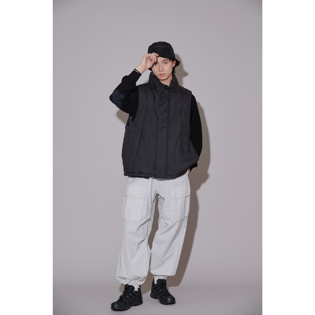 アクティブな休日や街歩きには、中綿ベストがちょうどいい気分。ミーンズワイル(meanswhile)の中綿ベストは、ダウンのような暖かさを持ちながら、バッグいらずの収納力を誇る便利アイテムです。ボトムスにはクリーンなホワイトのカーゴパンツを合わせ、メリハリをつけることで重たく見えず、軽快な印象をキープしてくれます。仕上げに、バケットハットと、足元はトレイル系スニーカーで、ゴープコアらしい実用性もしっかり確保。