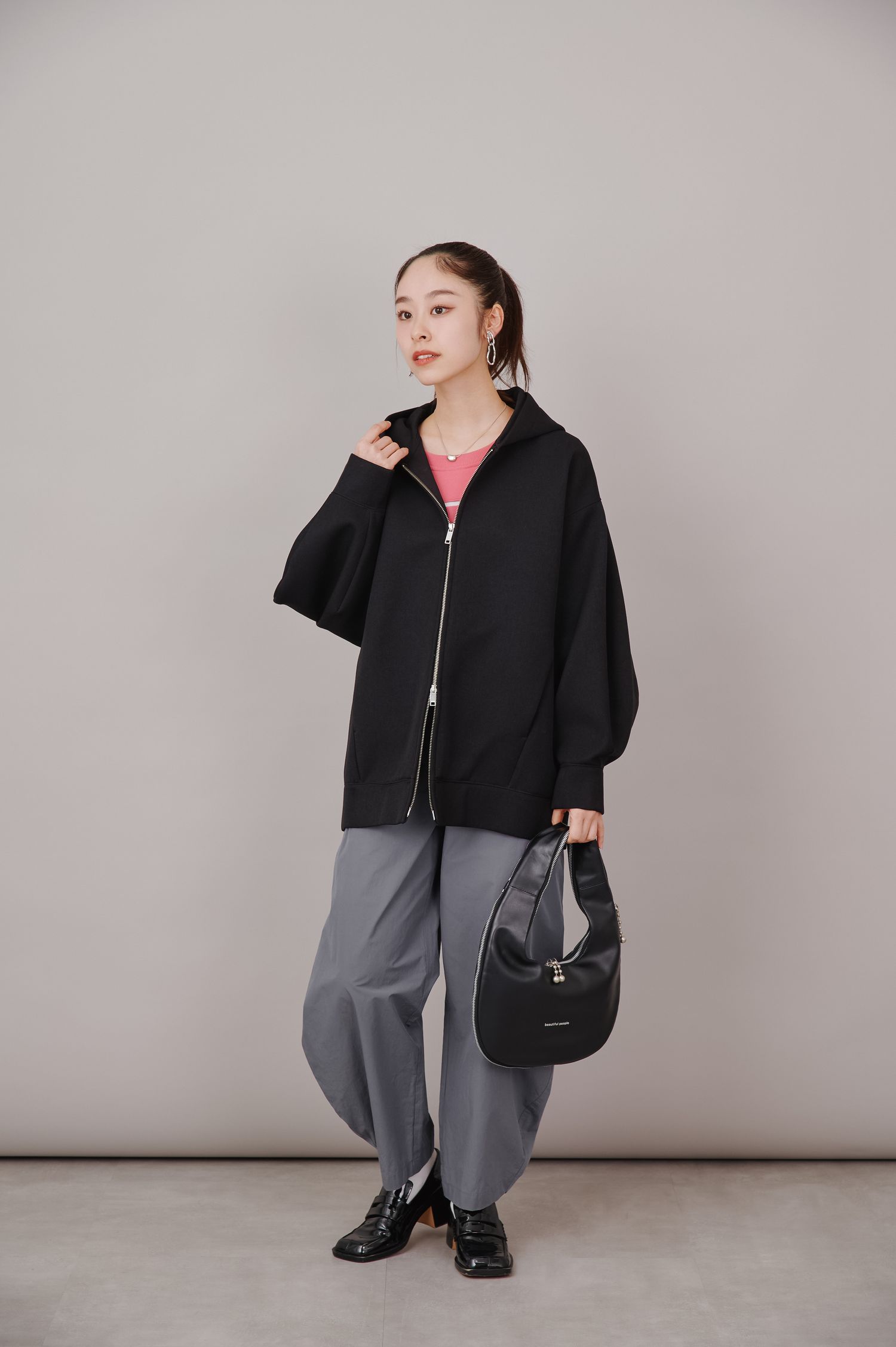 スカートパンツは、気分やシーンに合わせてスカートを巻いたり外したりできるのが魅力で、実は旅行にぴったりのアイテム。1着で印象を変えられるため、荷物を増やさず着こなしの幅を楽しめます。今回はグレーのスカートパンツに黒のトップスを合わせ、最旬スポット巡りにも自然になじむモードな装いに仕上げました。