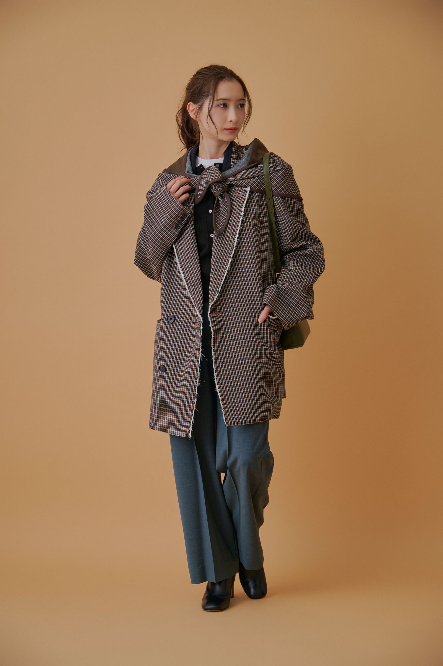 トレンド感のあるスカーフ付きジャケットを主役にした、冬の韓国旅行にぴったりのコーディネート。スカーフは首元に巻いたり、顔まわりにアレンジしたりと表情を変えられるため、毎日印象を変えたい旅先で重宝します。ボトムスにはセンタープレス入りのワイドパンツを合わせ、歩きやすさとスタイルアップを両立したバランスに。