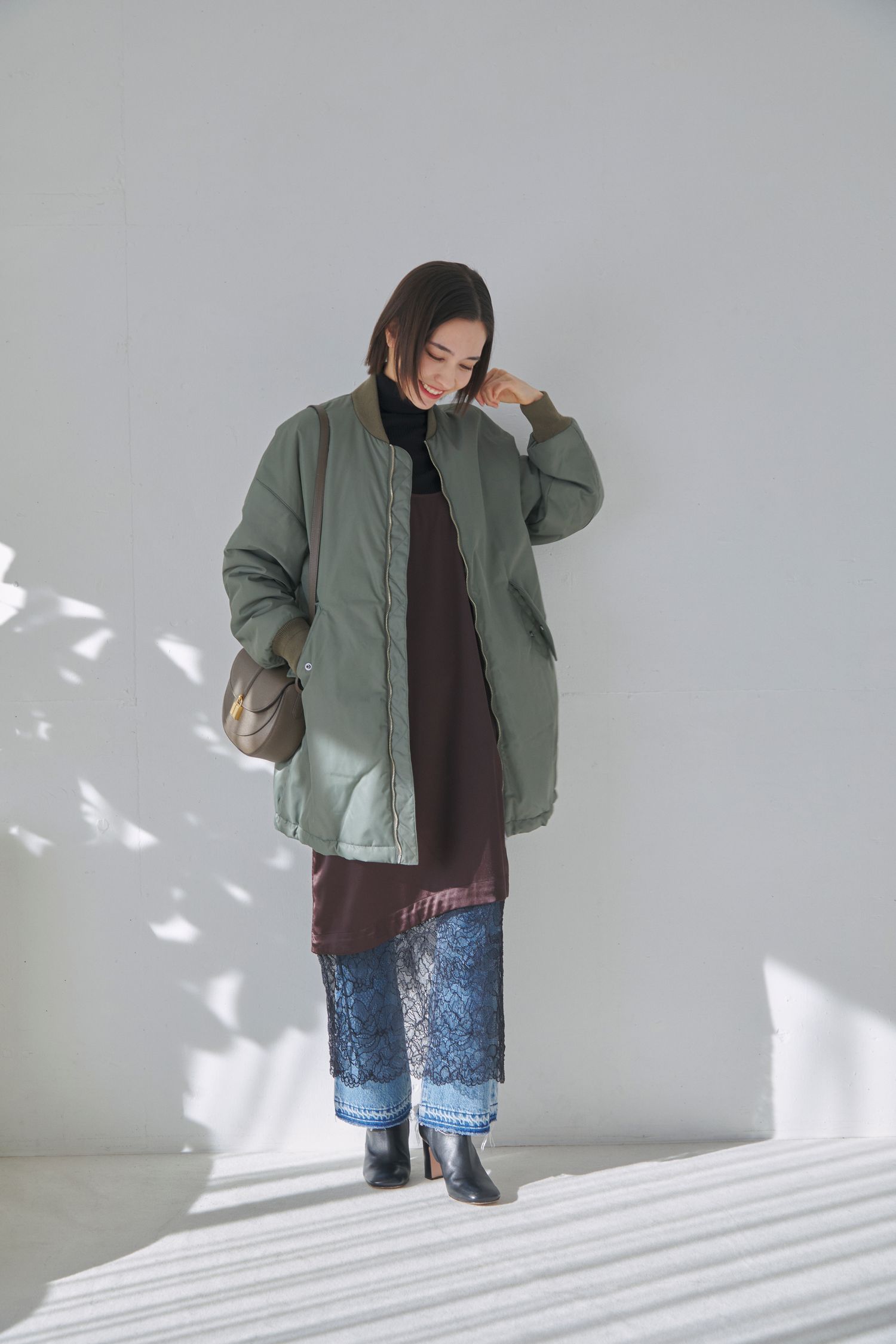 寒さの厳しい冬の韓国旅行には、さっと羽織れるボリューミーなアウターが心強い味方。インナーにはタートルネックニットに、裾に繊細なレースが施されたキャミワンピを重ね、旬のレイヤードでコーデに表情をつけて。キャミワンピは着回し力が高く、旅の様々なシーンに活躍するのも嬉しいポイント。ボトムスにライトブルーのデニムを合わせることで、重くなりがちな冬コーデにほどよい抜け感をプラスできます。