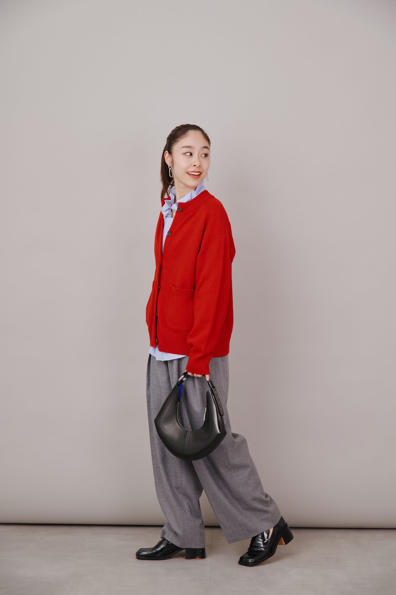 写真映えを意識するなら、普段手が伸びにくい色鮮やかなトップスを取り入れるのもひとつの手。ブルーのブラウスに赤のニットカーディガンを重ねてカラーコントラストを効かせることで、ふとした瞬間の写真まで印象的に仕上がります。