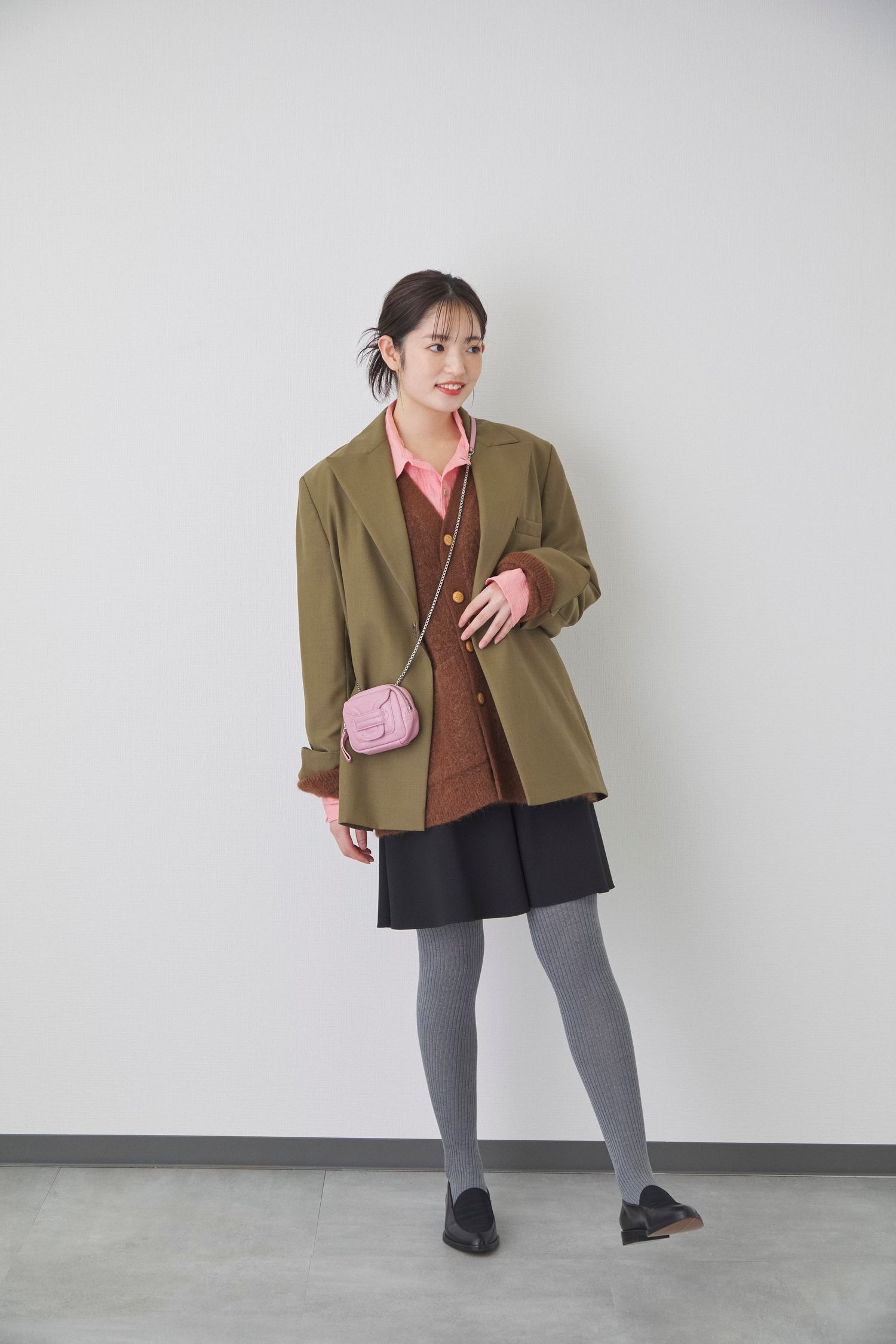 韓国旅行では、K-POPアイドルの私服を意識したスタイリングを取り入れてみるのもおすすめ。ミニスカートにタイツを合わせれば、肌見せを控えつつトレンド感のあるバランスに仕上がります。甘さのあるピンクのシャツやバッグも、マニッシュなジャケットを羽織ることで、落ち着いた印象に。