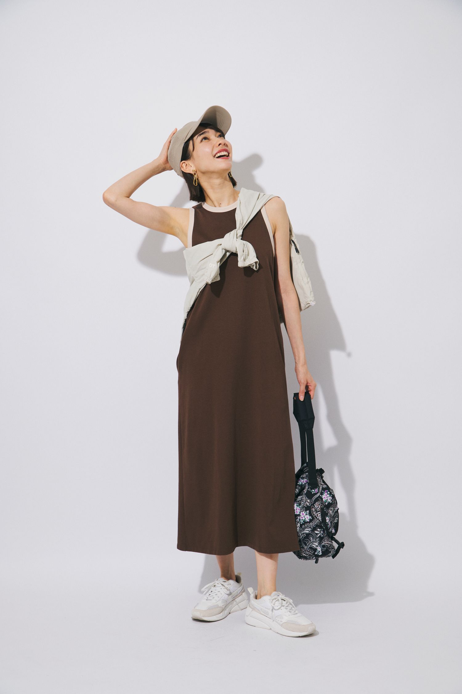 まだ暑さが残る秋の始まりは、秋色×ノースリーブで無理なく季節感を取り入れるのがおすすめ。落ち着いたブラウンカラーを選べば、涼しさをキープしながらも装いに秋らしいムードが漂います。足元はスニーカーで歩きやすさを確保しつつ、軽めの羽織りをプラスすれば、気温差にもスマートに対応できるコーデに。