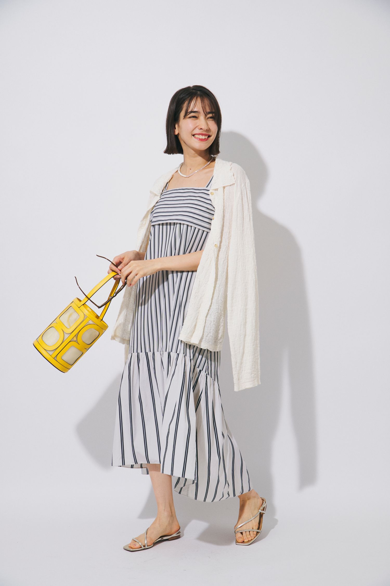 夏の旅行には、1枚でコーデが完成するリゾートワンピースも心強い選択肢に。ノースリーブタイプなら、インナーや羽織りを変えるだけで印象を調整でき、着回し力も抜群です。今回は冷房や紫外線対策として、ドライなタッチのポロカーディガンをチョイス。日差し対策としてサングラスも持っておくと便利です。