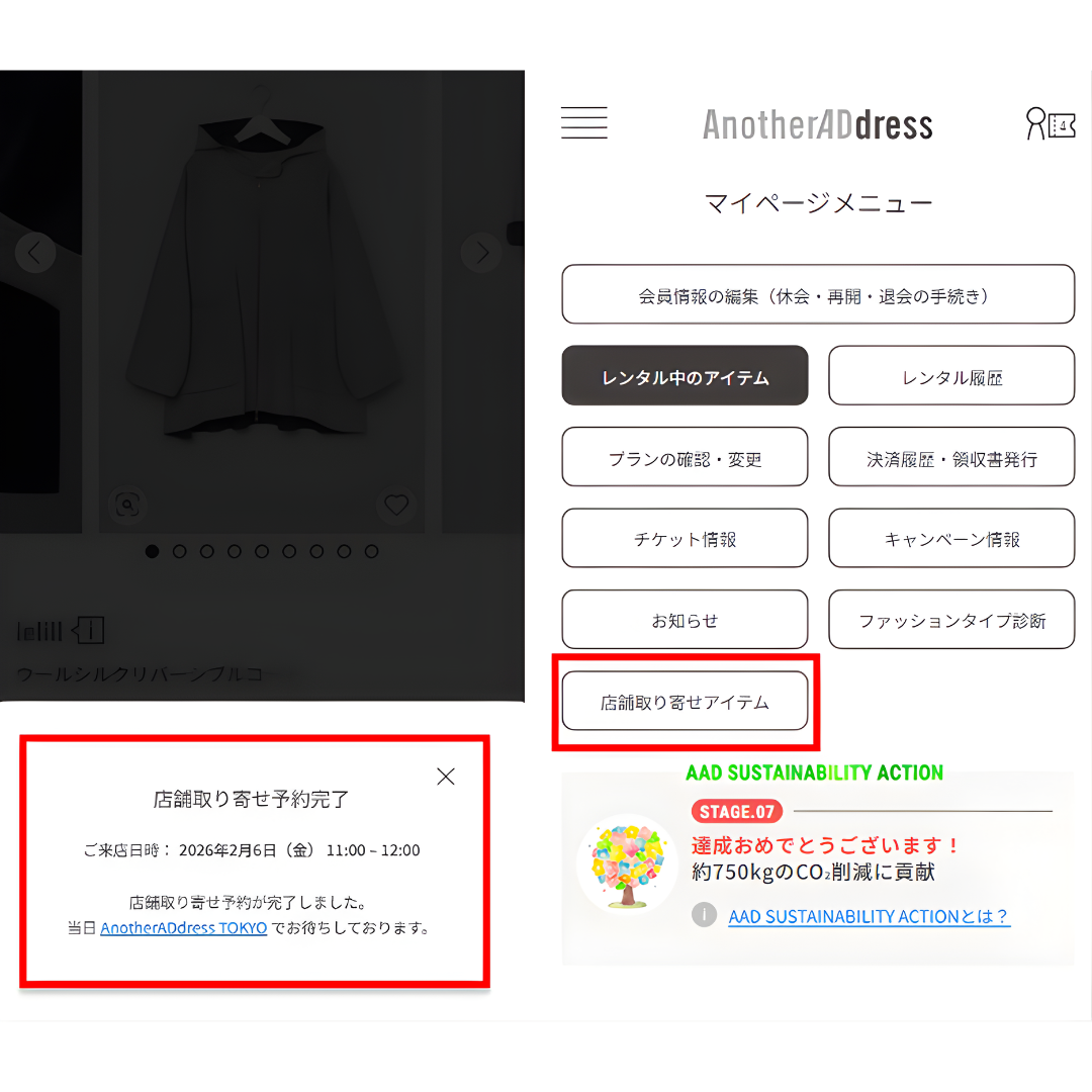 また、アナザーアドレスのオンラインで展開しているアイテムは、1月30日(金)より最大5着まで取り寄せ可能です。実際に手に取って、素材の質感や色味、サイズ感を確かめてからレンタルできるので、「届いてみたらイメージと違った」という失敗を防げます。※ロングライフアイテム、アートは店舗取り寄せ対象外となります。