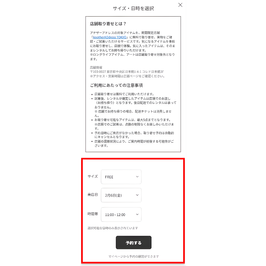 「店舗取り寄せ」を押すと、試したいサイズ・来店日・時間帯を選択できます。希望のサイズや日時を決めて「予約する」を押して完了です。サイズや来店日時の変更については、アナザーアドレスの公式LINEよりお問い合わせをお願いいたします。