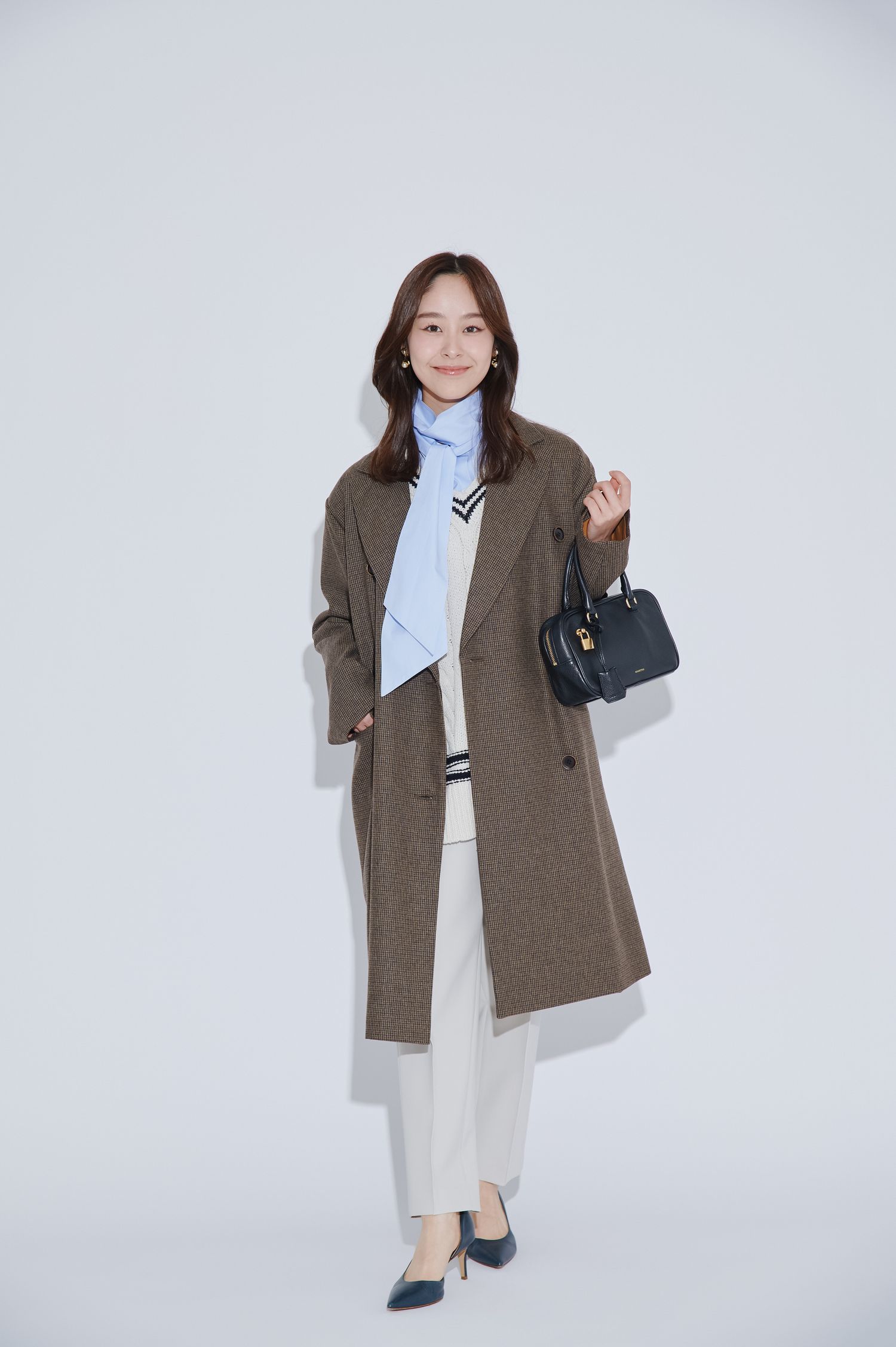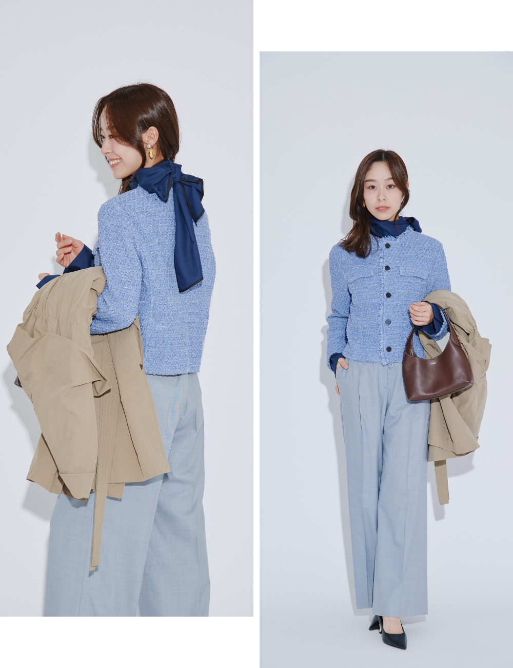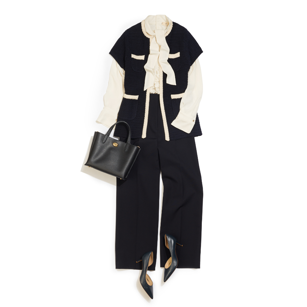 今回は、ニットツイードジャケットを主役にブルーでまとめたクールなワンカラーコーデに、ネイビーのボウタイブラウスをイン。後ろでボウタイを結べば、フロントはすっきりと見せつつ、後ろ姿に上品なアクセントが効いた着こなしに。