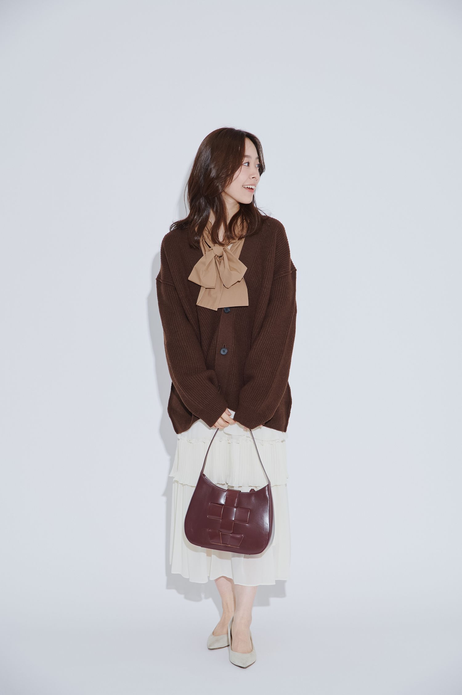 全体をまろやかなブラウンとホワイトでまとめて、ボウタイはフロントでリボン結びに。クラシカルなムードが漂う、冬のデートのぴったりな甘めコーデに。
