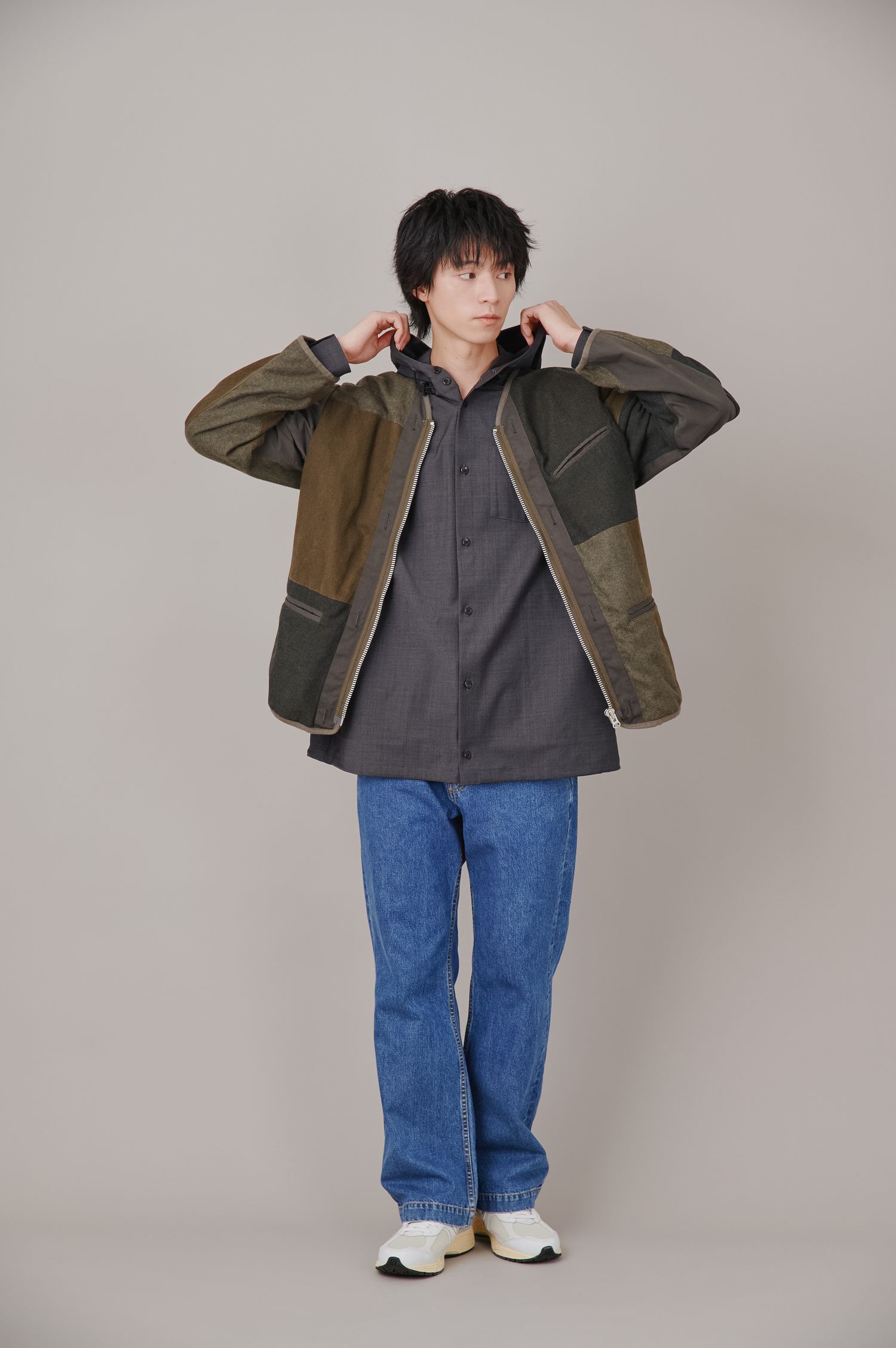 ほどよくインパクトのあるパッチワークデザインのアウターを主役にした、冬の休日コーデ。存在感のあるデザインながら、カーキやブラウンなど落ち着いた色味でまとめられているため、派手になりすぎず大人っぽい印象に仕上がります。インナーはシンプルなシャツ、ボトムスはデニムで引き算を意識することで、アウターの個性が引き立ち、きれいめカジュアルとしてバランス良く着こなせます。