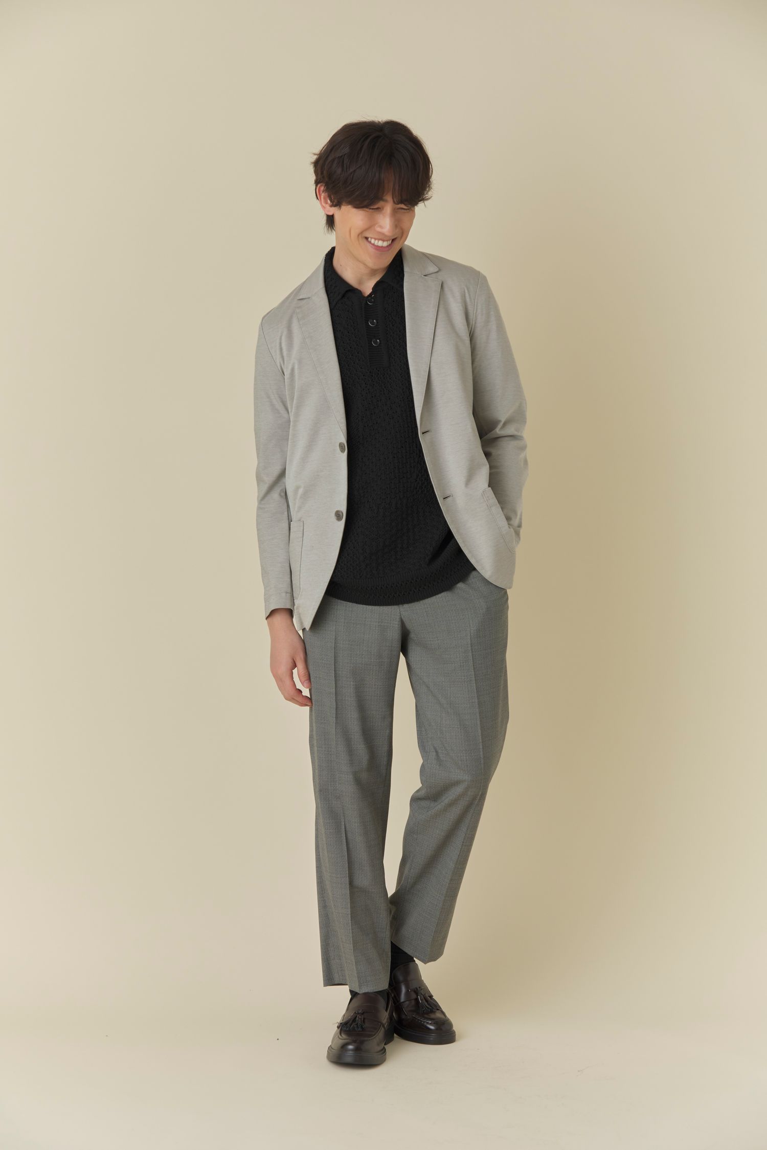 きちんと感が求められるデートシーンには、やはりジャケット×パンツのジャケパンスタイルが頼れる存在。インナーは、シャツだと堅く、Tシャツだとカジュアルすぎてしまうため、ほどよいバランスのポロシャツをセレクト。中でも黒のレース素材なら、上品さを保ちながらさりげなくこなれ感をプラスできます。