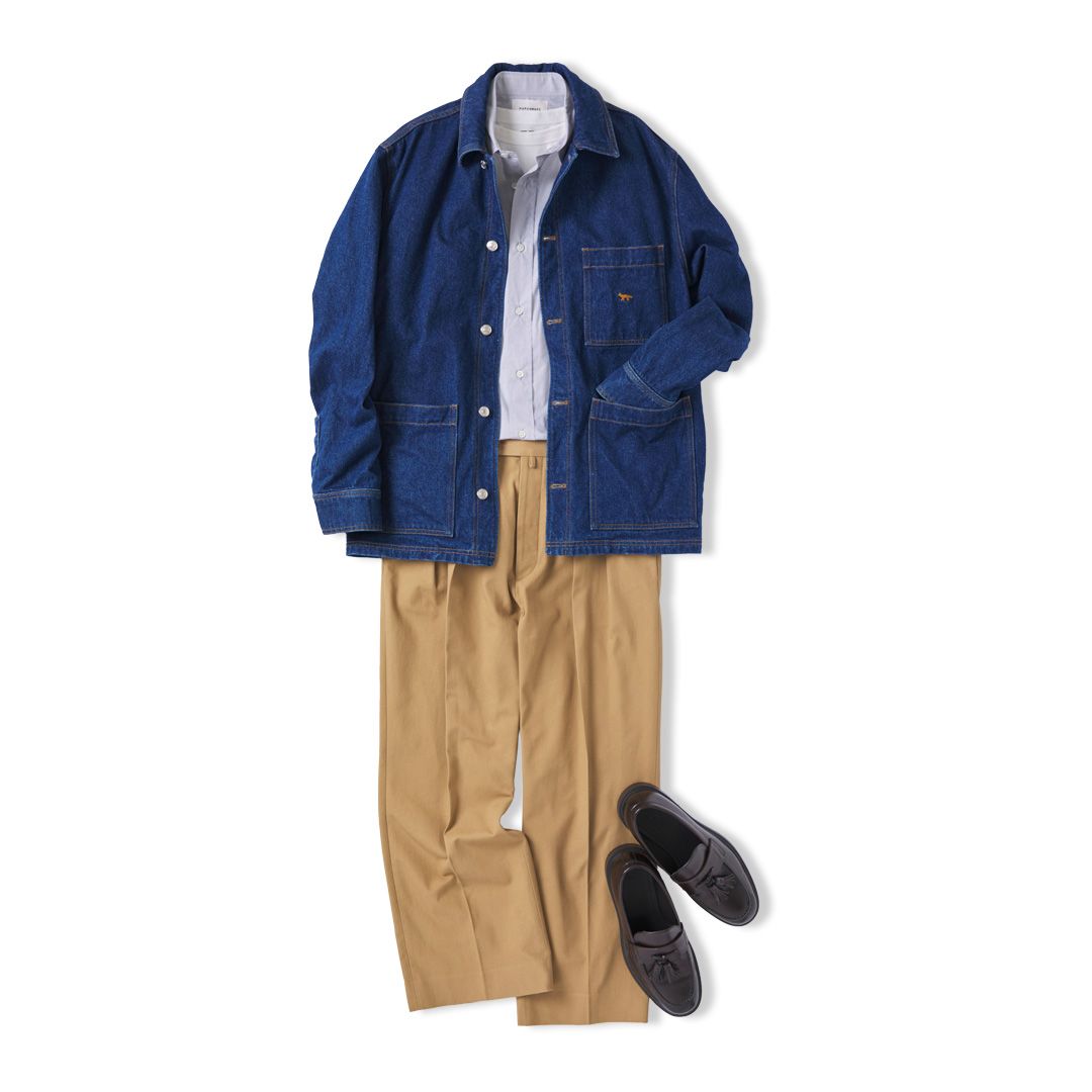 春の王道アウター・デニムジャケットを主役にした、カジュアルなメンズファッション。インナーにはベーシックなシャツを合わせ、ボトムスはデニムと相性抜群のチノパンをチョイス。仕上げにローファーを取り入れることで、上品なムードを後押し。