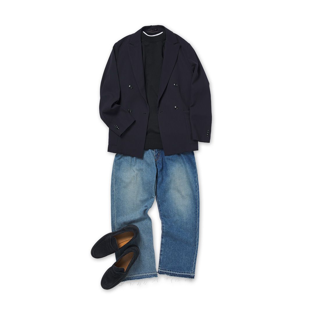 大人男性の春の休日コーデは、ジャケットを取り入れるのも一つの手。きれいめな印象のジャケットも、デニムと合わせればほどよく力の抜けた、こなれた着こなしに仕上がります。インナーや足元をシンプルにまとめることで、きちんと感とカジュアルさのバランスが取れた、大人の休日スタイルに。