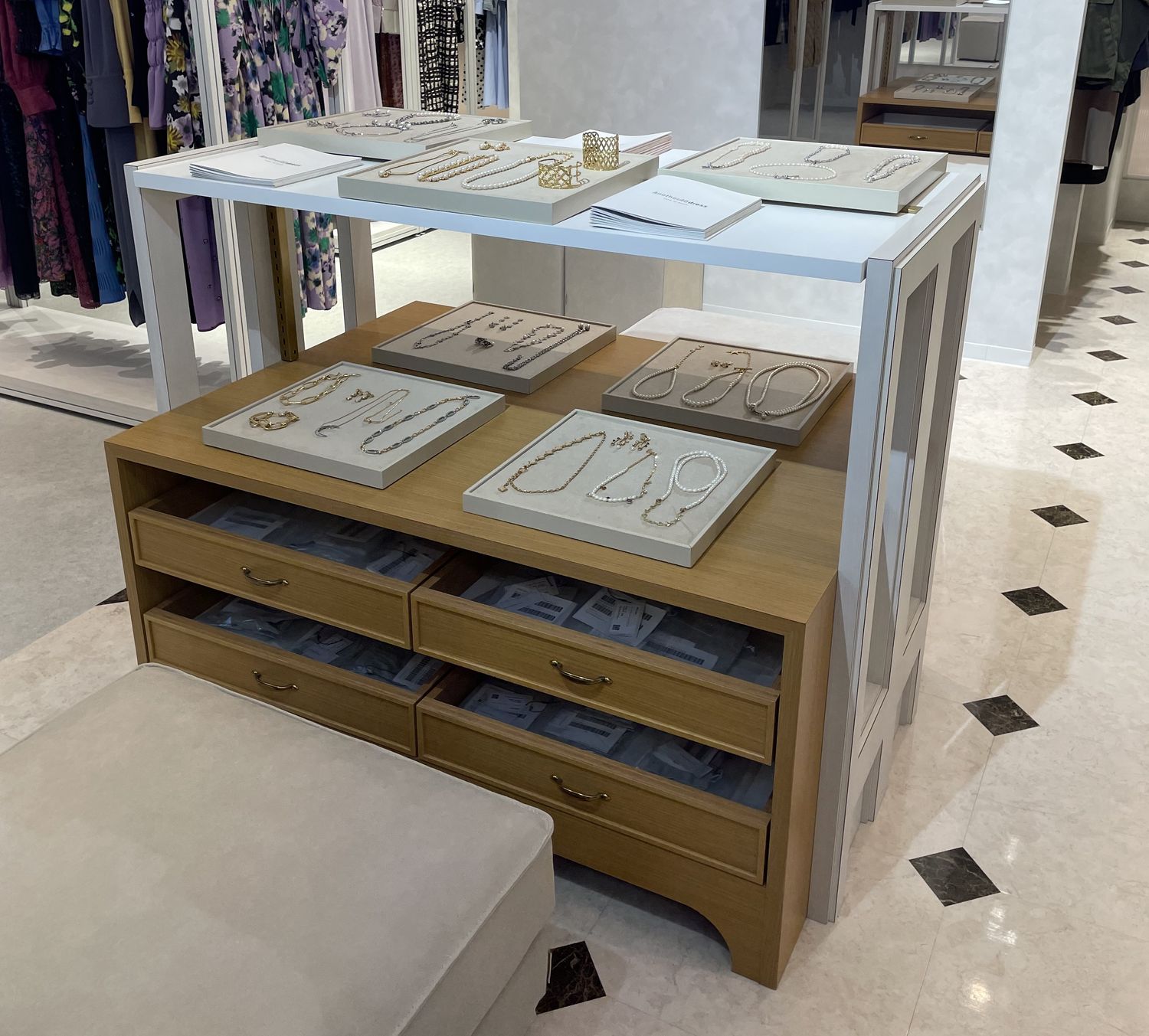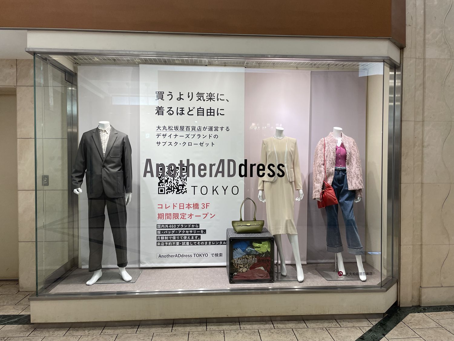 日本橋駅B12番出口から直結でコレド日本橋へ。館内に入ると、右手に「AnotherADdress TOKYO」のウィンドウディスプレイがお出迎え。