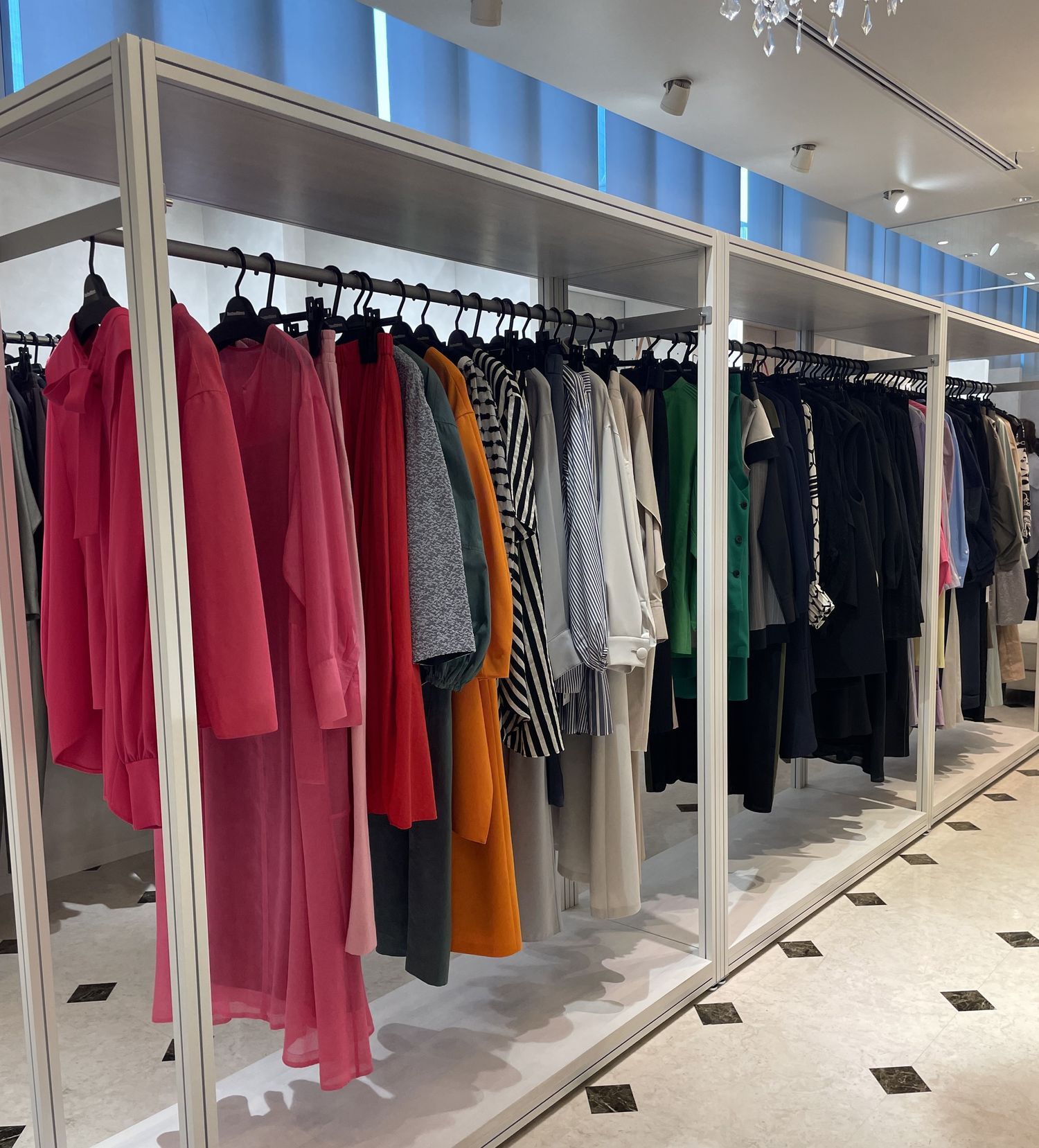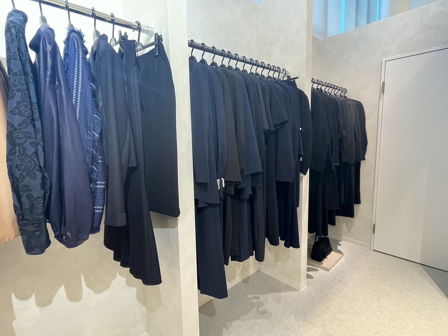 店内に入って左側から奥にかけては、主にレディースアイテムが並ぶゾーン。オン・オフどちらのシーンにも対応できるアイテムをはじめ、卒業式や入学式といったオケージョンシーンにも合わせやすい一着まで、幅広いラインナップが展開されていました。