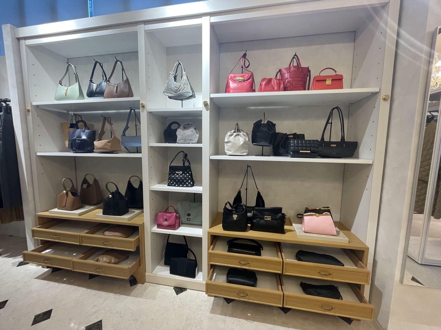店内左側にはバッグコーナー、中央にはアクセサリーコーナーも。すぐ隣に大きな鏡があるので、気軽に合わせられます。