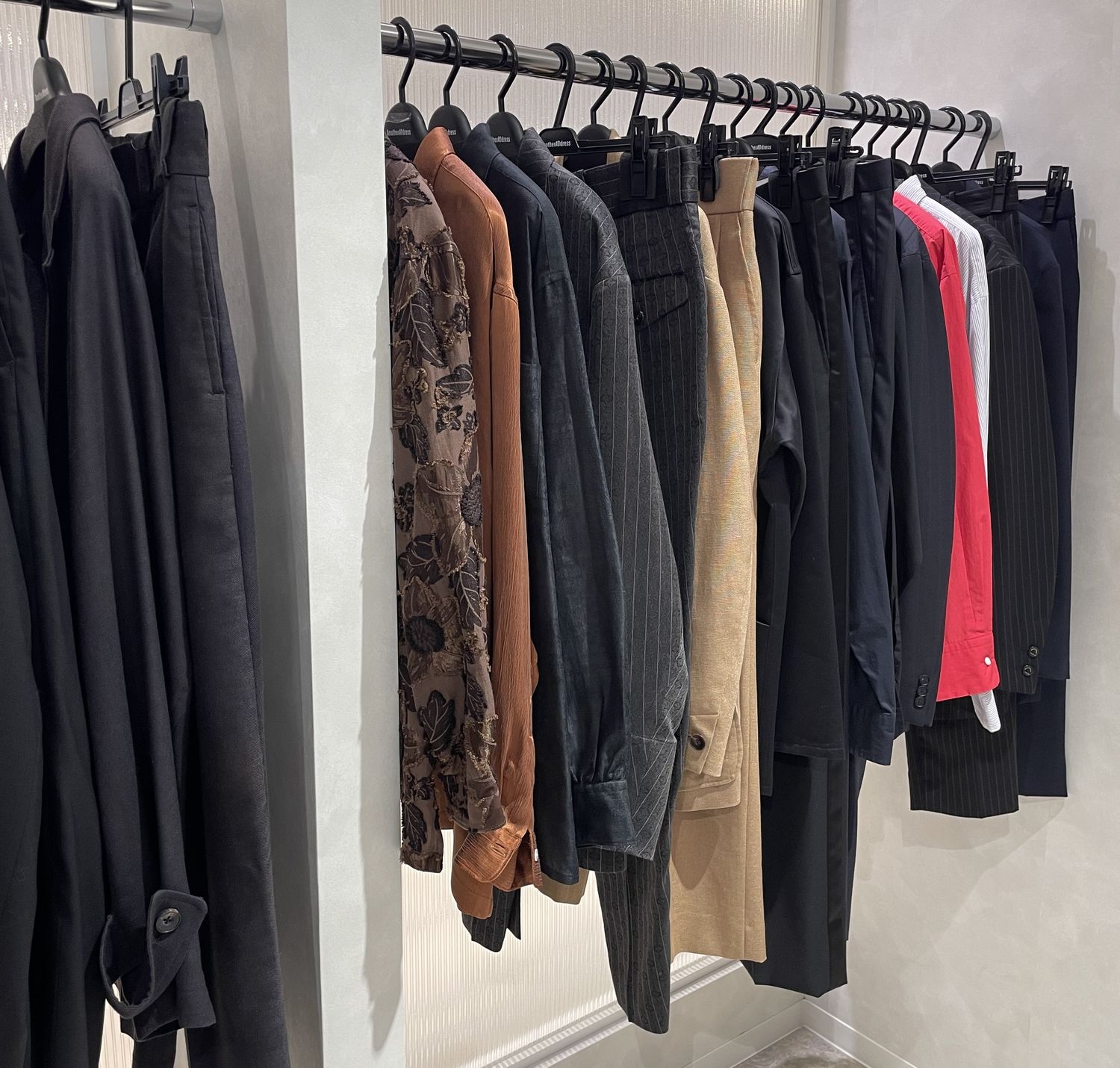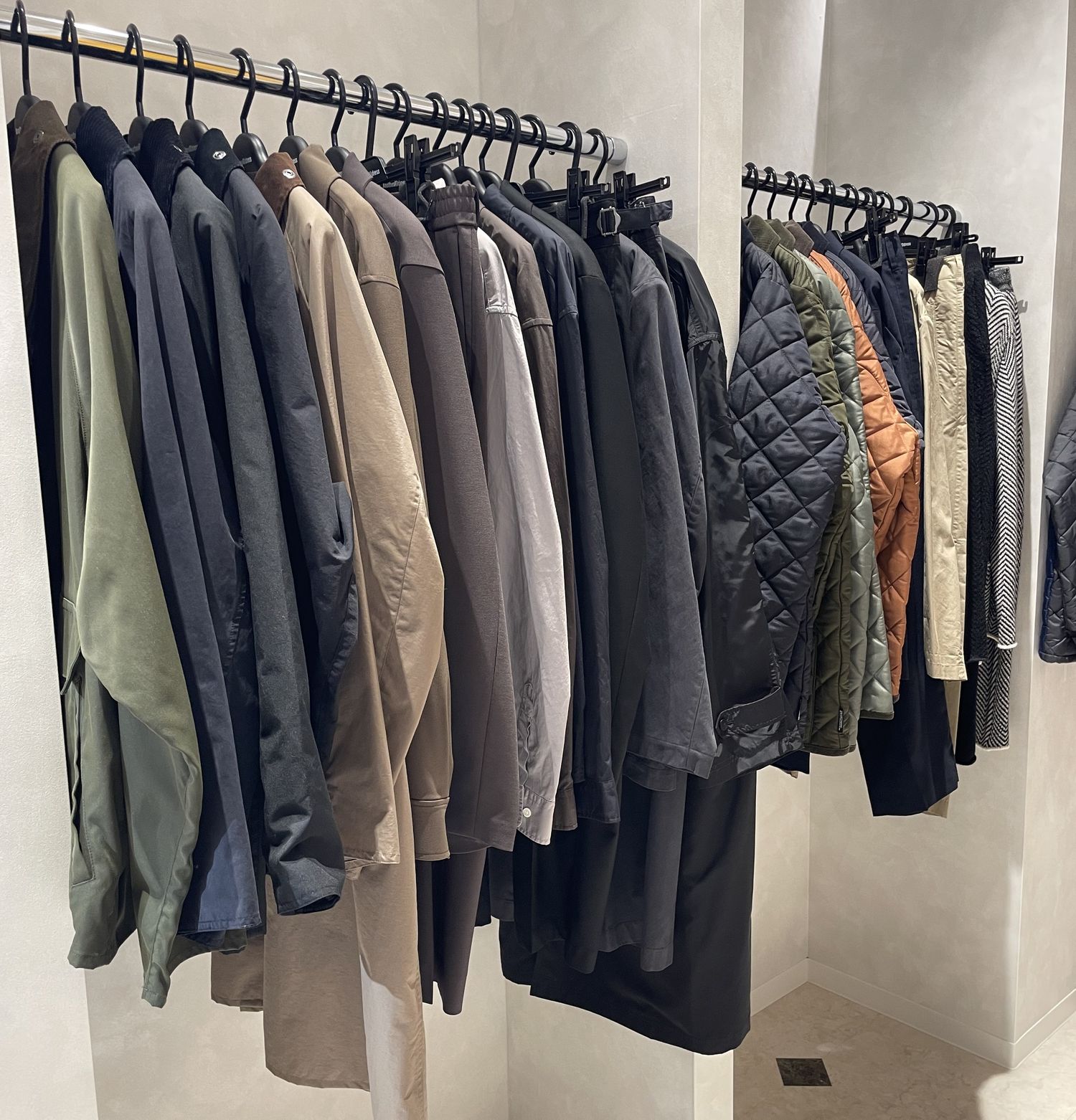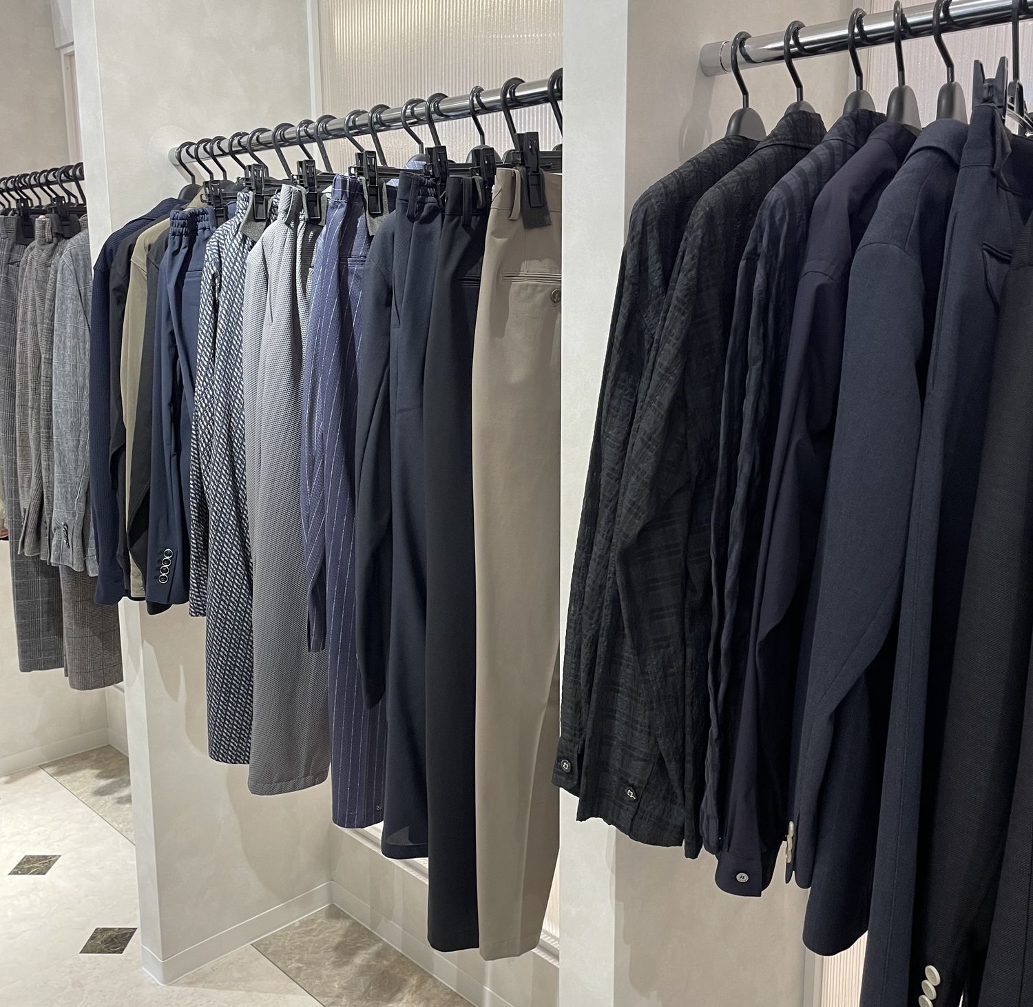 店内右側にはメンズゾーンが展開。通勤やオフィスカジュアルに使えるセットアップから、日常使いしやすいベーシックアイテム、トレンド感のある一着まで、幅広く揃っています。
