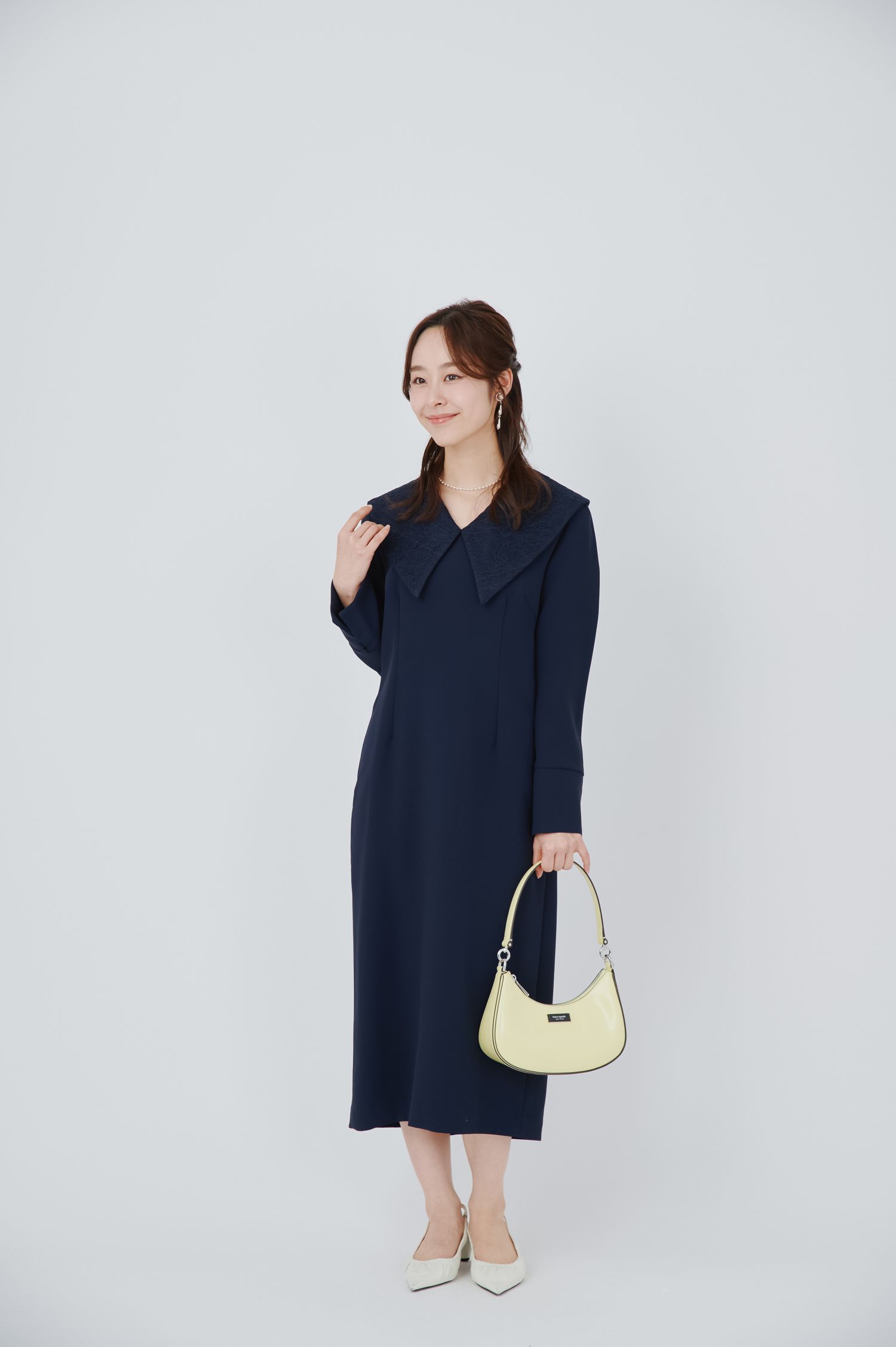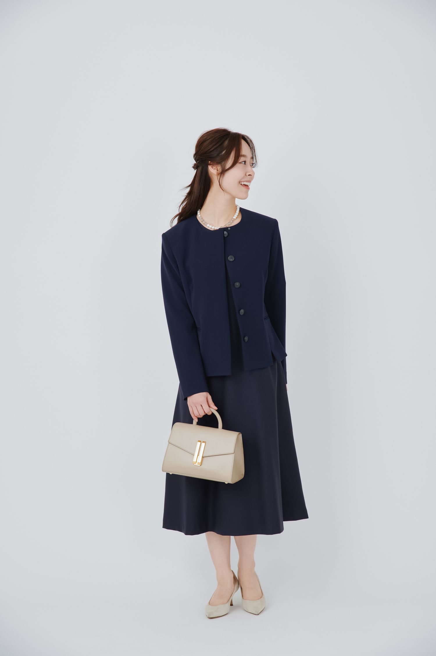 バッグや靴はシンプルで上品なものを選ぶのが正解。ブラックやベージュのパンプス、レザーのハンドバッグなら間違いありません。アクセサリーはパールジュエリーなど、きちんと感をプラスできるものを選びましょう。
