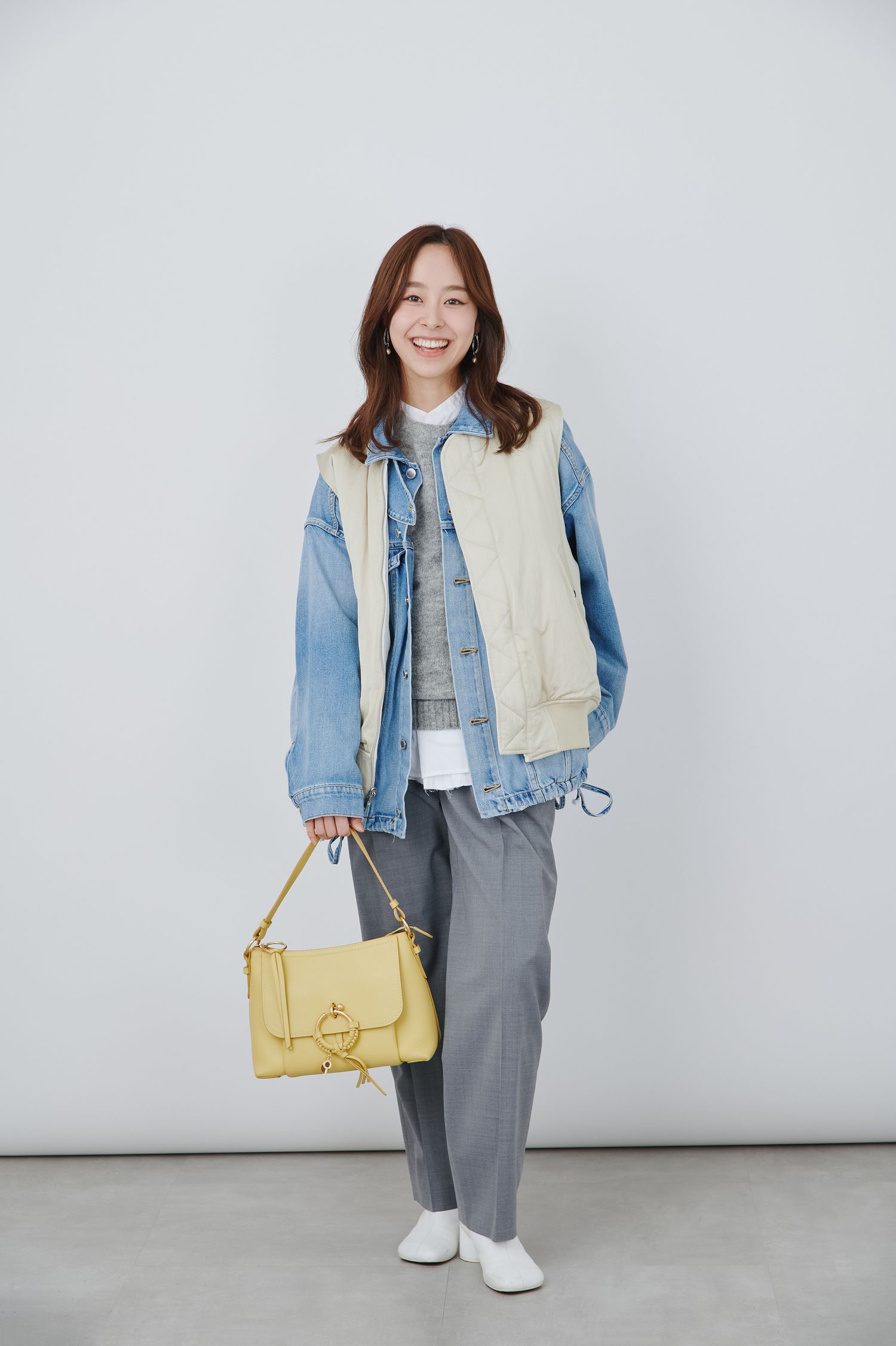 3月上旬は寒さ対策が欠かせない時期ですが、複数のアイテムを重ねるレイヤードで調整するのもおすすめ。春の定番アウター・デニムジャケットに中綿入りのベストを重ねれば、防寒しながらも春らしい軽やかさを演出できます。インナーも、ウールニット×コットンシャツのレイヤードでしっかりと防寒。手元には、パステルイエローのバッグを添えて、華やかなアクセントをプラスして。