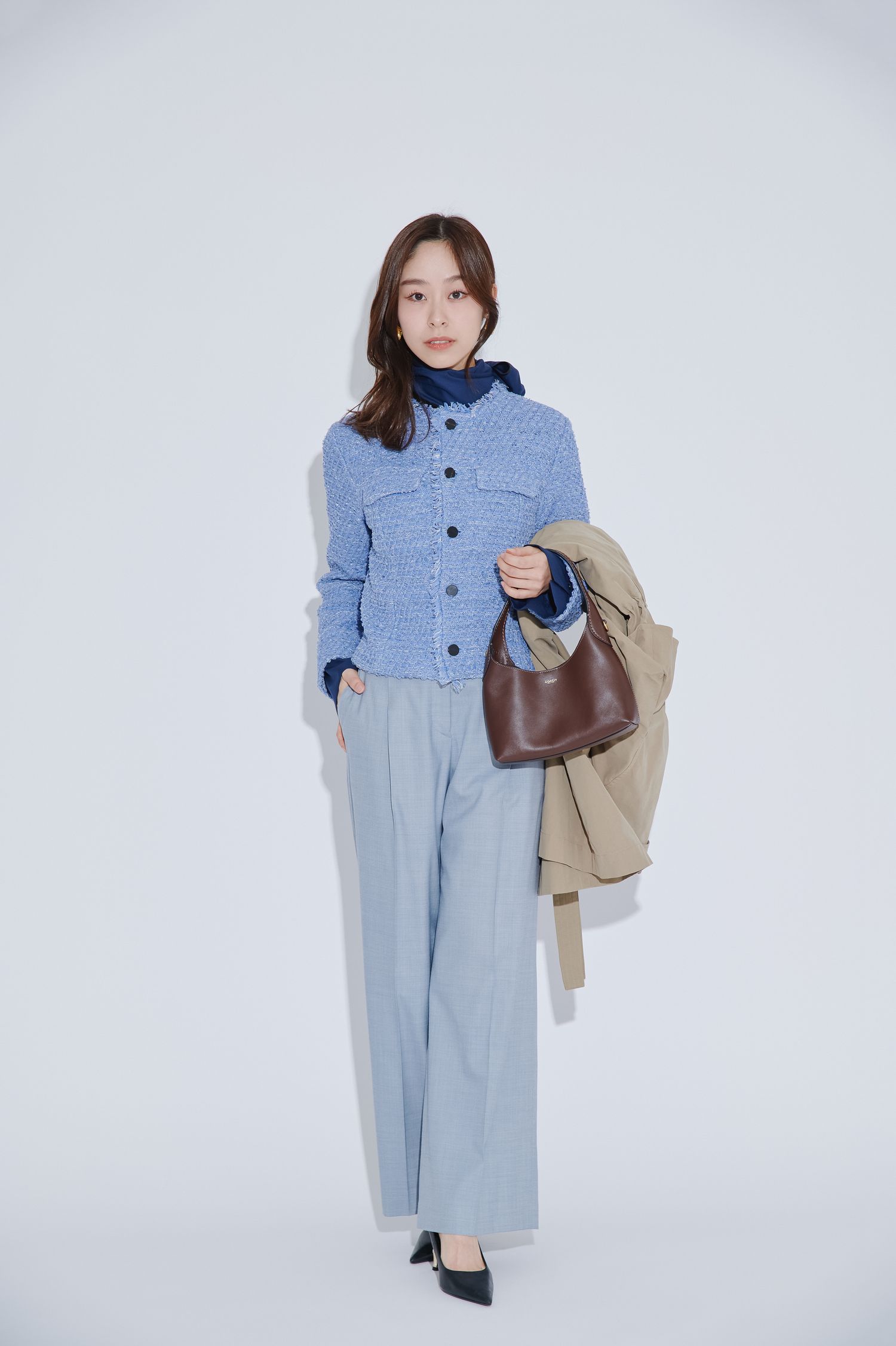 パステルブルーのニットツイードジャケットを主役にしつつ、ネイビーのボウタイブラウスを合わせて、きちんと感と華やかさをプラスした3月中旬におすすめのコーディネート。アウターは、合わせるアイテム次第でオンオフ問わず着用できる万能アウター・トレンチコートをチョイス。