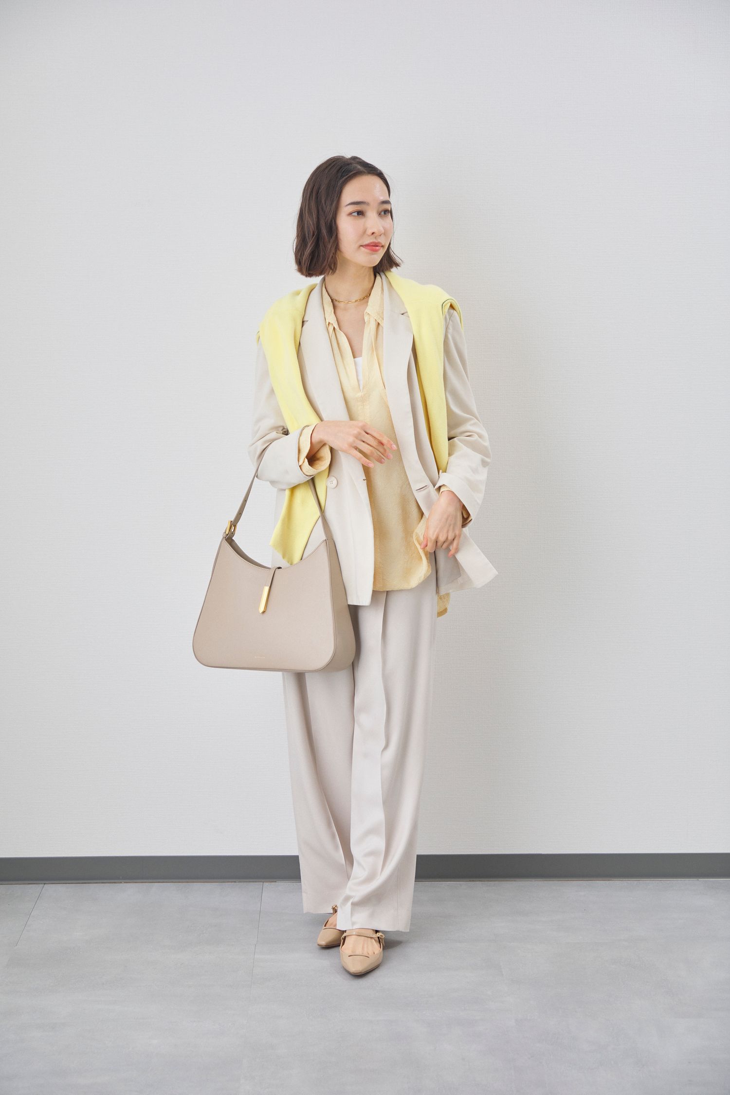 いつもの通勤コーデもパステルカラーを選ぶだけで、ぐっと春らしい印象に!イエロー×ベージュのツートンコーデなら、春らしい明るさを演出しつつ、オフィスにもなじむ上品な印象に仕上がります。3月の体温調節に欠かせないニットカーディガンは、肩掛けすることでこなれ感アップ。