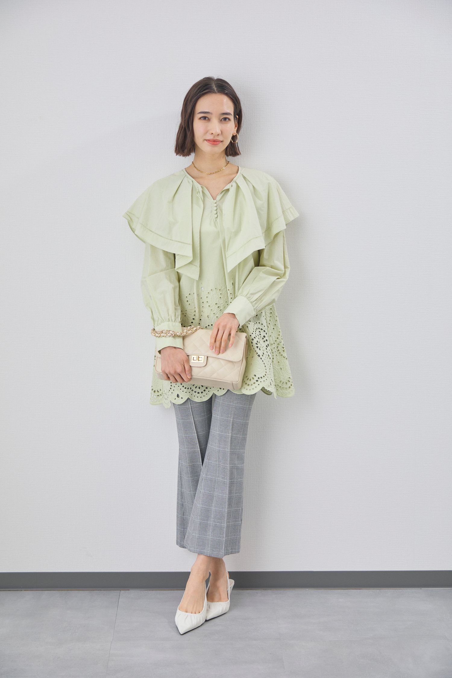大胆なフリルと繊細なカットワークレースが女性らしい華やかさを引き立てるジル スチュアート(JILL STUART)のチュニックブラウス。パステルグリーンの優しい色味が、春らしい軽やかなムードを演出してくれるのも嬉しいポイントです。トップスに甘さがある分、ボトムスはチェック柄のフレアパンツを合わせて、大人っぽくバランスを調整。手元にキルティングバッグを合わせれば、上品かつエレガントな春のデートコーデが完成します。