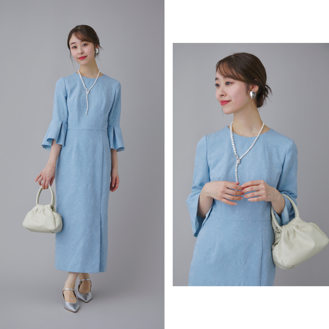淡いブルーのドレスにシルバーアクセサリーを合わせた、上品で涼しげなお呼ばれコーデ。艶のあるシルバーイヤリングとロングネックレスが顔まわりを明るく見せ、清楚で洗練された印象に導きます。バッグは白を選んで、軽やかにまとめました。