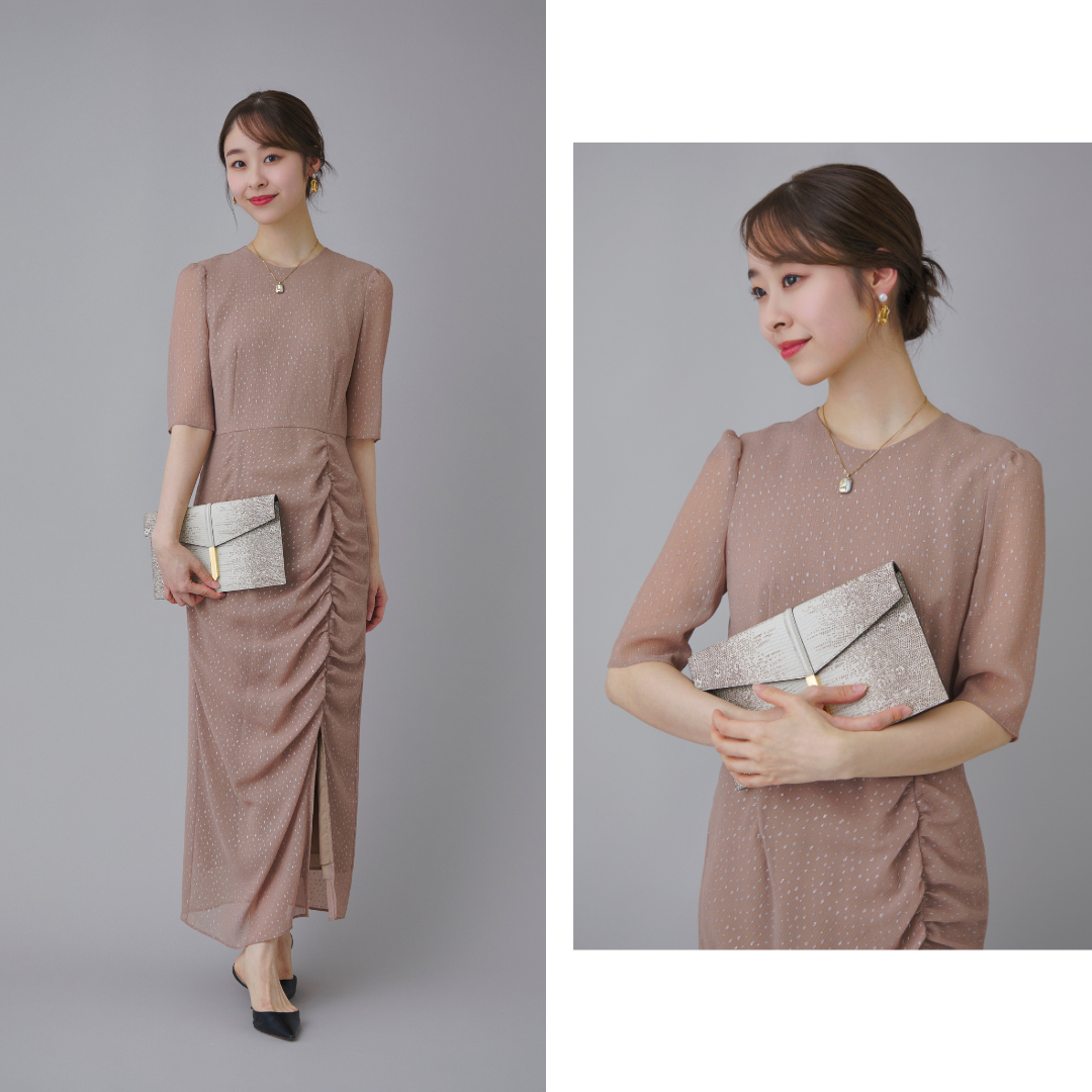 やわらかなベージュドレスにゴールド×パールのアクセサリーを合わせた、華やかなお呼ばれコーデ。耳元とネックレスにゴールドのさりげない輝きを添えることで、エレガントで女性らしい華やぎが生まれます。クラッチバッグもゴールド金具のものを選べば、統一感が生まれ洗練された印象に。