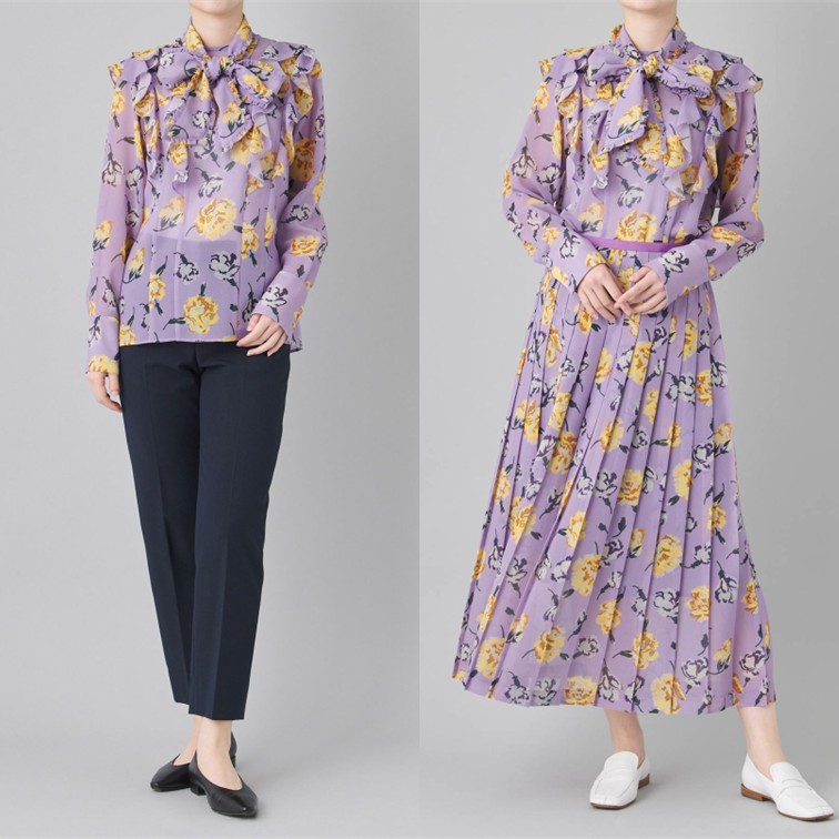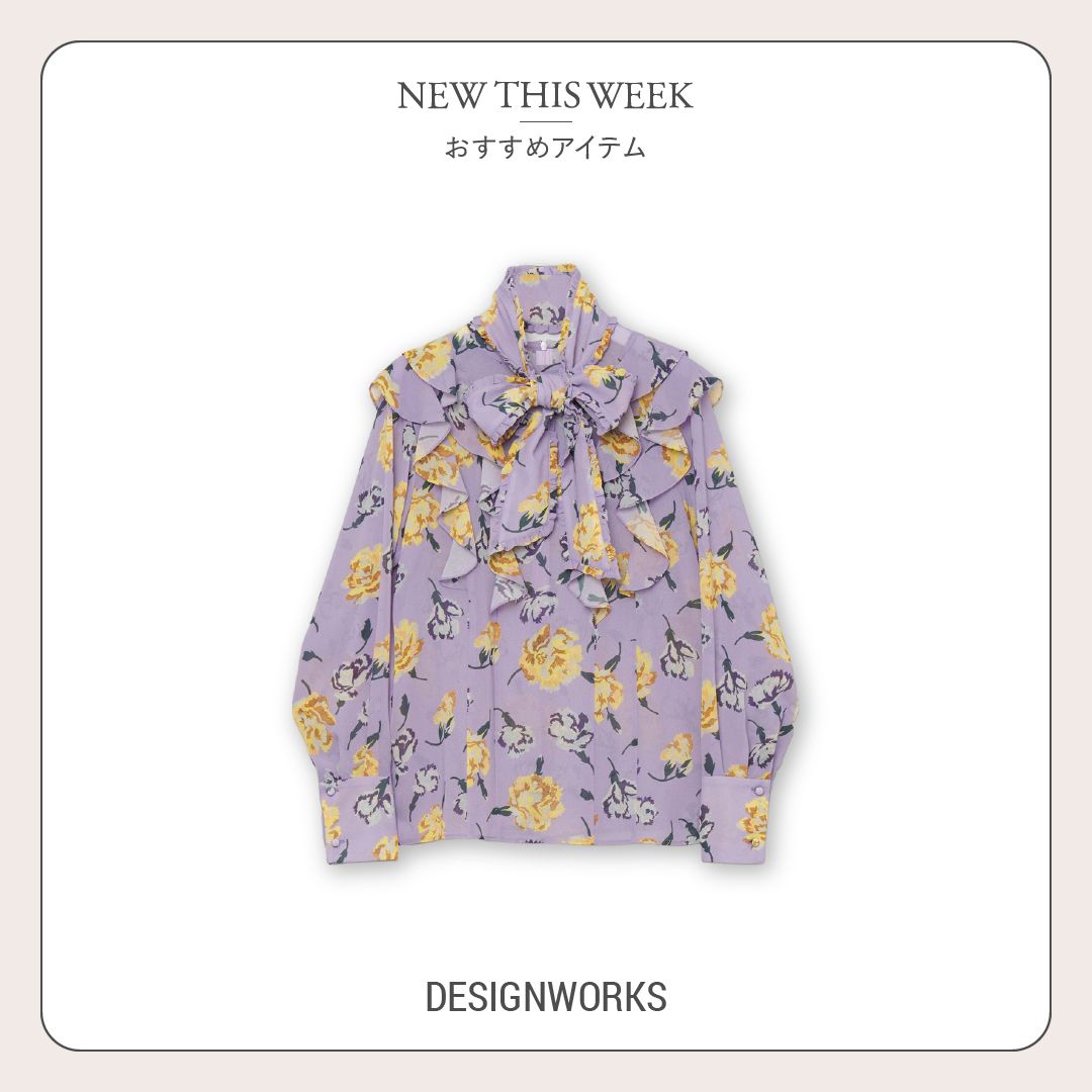 最初にご紹介するのは、取り入れるだけでぱっと華やぐデザインワークス(DESIGNWORKS)のフラワープリントブラウス。全体に施された繊細なカーネーションプリントが、クラシカルなムードを演出する1着です。
