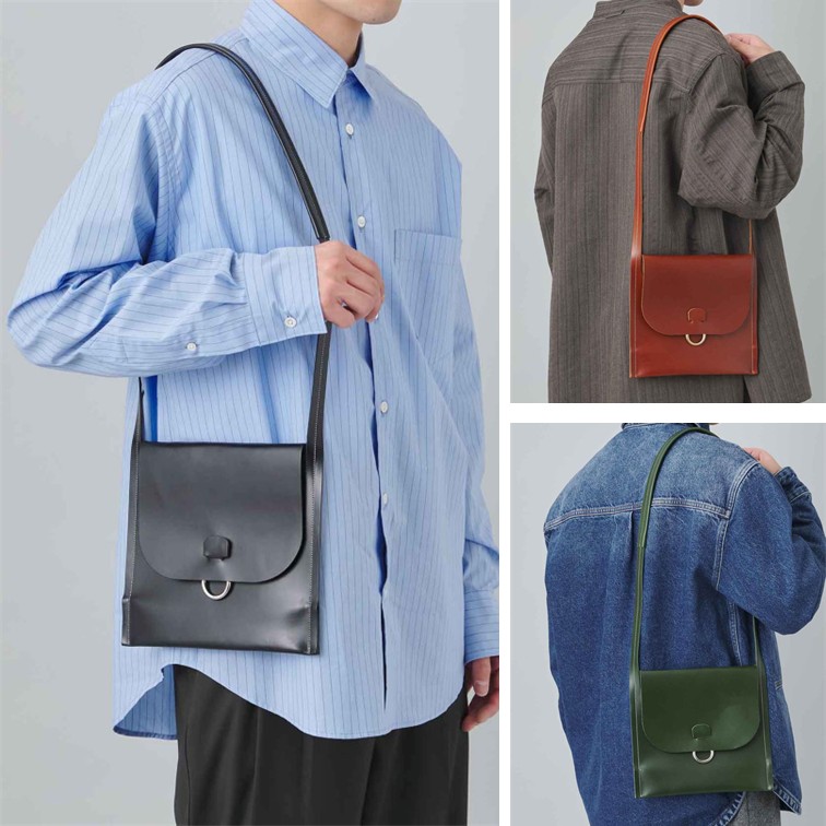 1枚の革を折りたたんだ本体に、アクセントとして白ステッチとリングを効かせたこちらのバッグは、職人の確かな技術と素材そのものの質感を存分に楽しめる一品。カラーバリエーションはブラウン、ブラック、カーキの3色展開で、いずれもスタイリングを選ばず、デイリーに取り入れやすいのも魅力です。