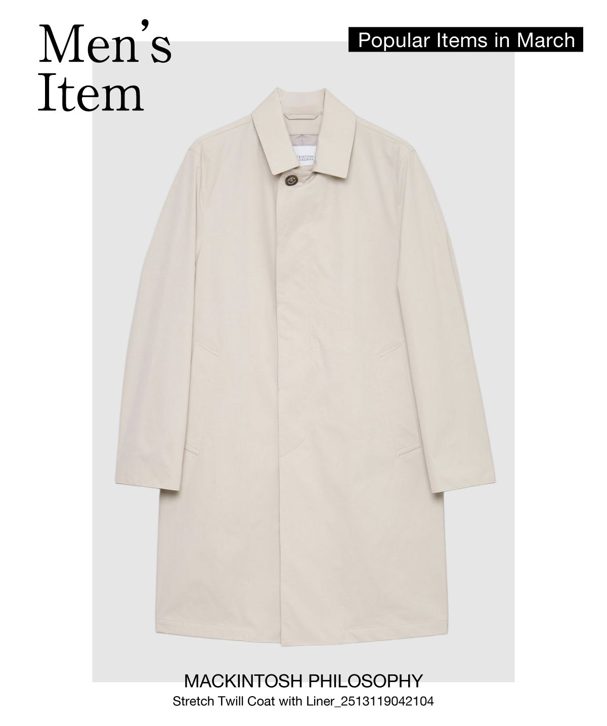 マッキントッシュ フィロソフィー(MACKINTOSH PHILOSOPHY)からオフィスシーンにぴったりな定番ステンカラーコートをピックアップ。調温機能を備えたライナーが付属しており、朝晩の気温差が大きい3月でも快適に着用できます。