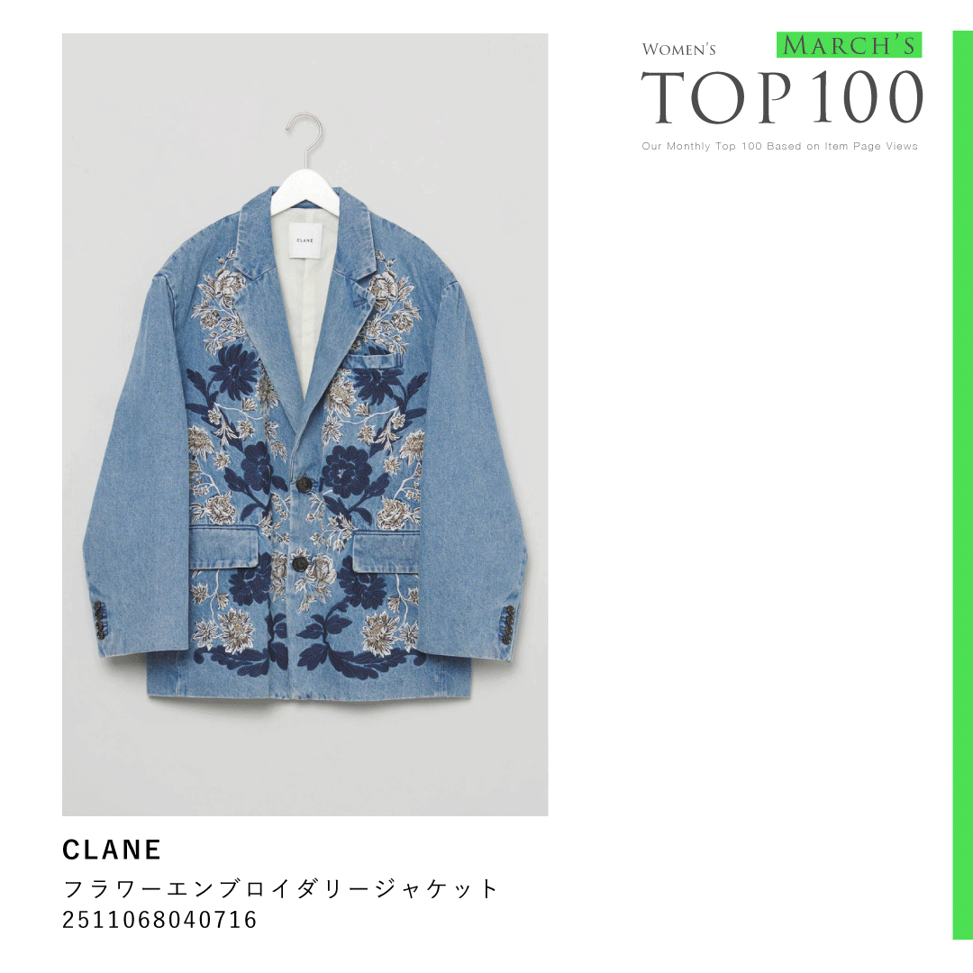 春の定番アウターとして外せないデニムジャケットは、クラネ(CLANE)からピックアップ。細やかな草花刺繍を大胆にあしらった、羽織るだけで存在感を放つアートピースのようなデザインが魅力です。