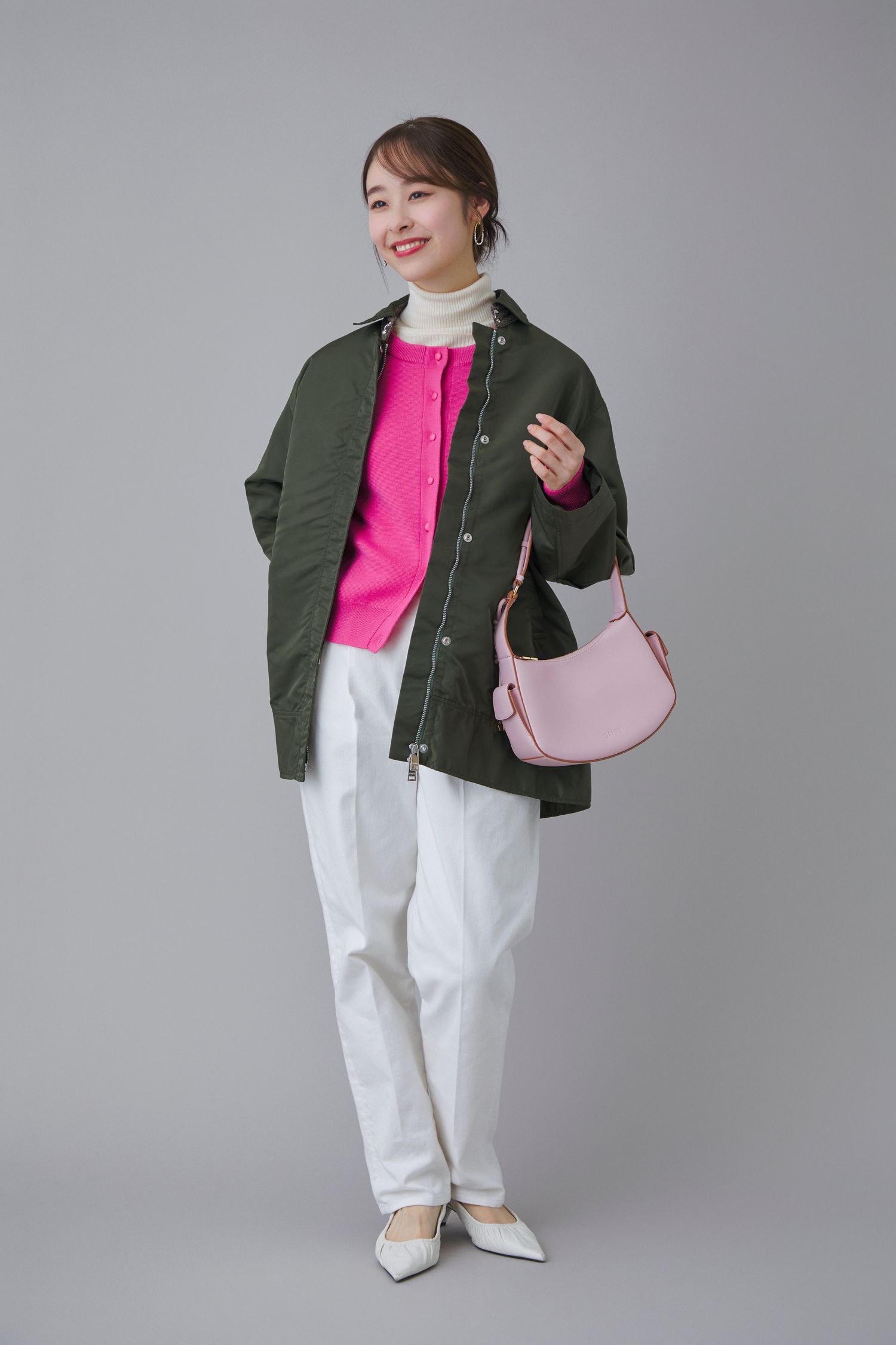 ボトムスにはクリーンな白のパンツを合わせて、色のコントラストをやさしく調整。仕上げに、淡いピンクのバッグで統一感と華やかさをさりげなくプラスすれば、春のお出かけにぴったりのスタイリングが完成します。
