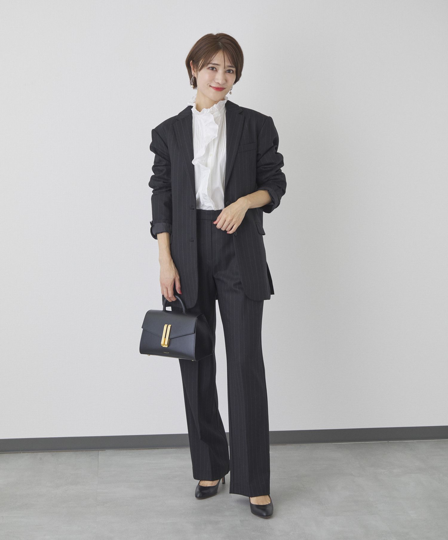 第3位は、ブラックの端正なストライプスーツに、軽やかなフリルブラウスを合わせた、洗練されたスタイル。シャープなシルエットが凛とした印象を与えながら、胸元のやわらかなディテールが女性らしさをさりげなく引き立ててくれます。小物とシューズもブラックでまとめれば、通勤からフォーマルなシーンまで対応できる、気品あふれる大人の装いに。