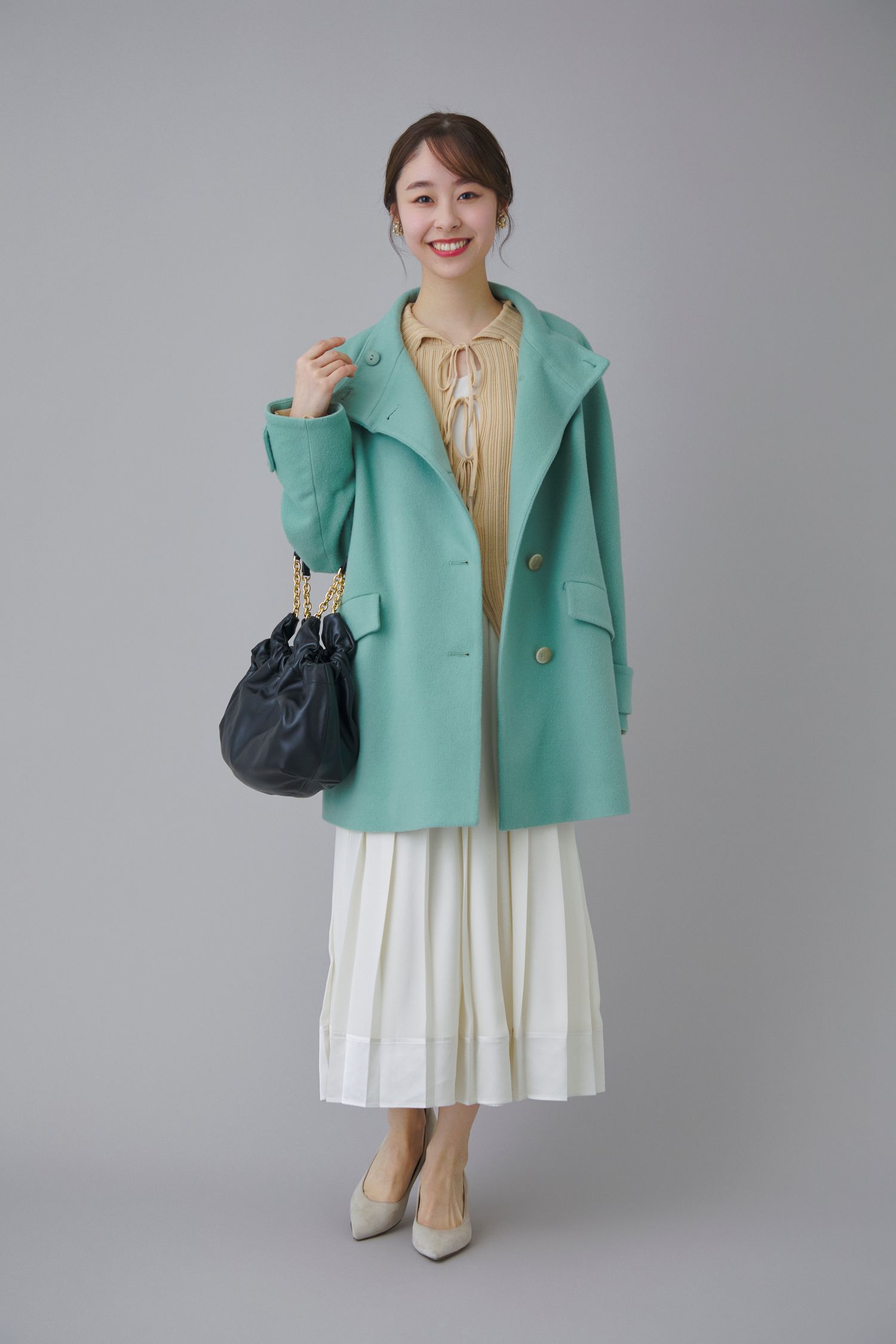 やわらかなミントグリーンのコートを主役にした、春の訪れを感じさせる上品なフェミニンコーディネートが第2位に。インナーには、フロントにあしらわれた繊細なリボンディテールが目を惹くベージュトップスを合わせ、ボトムスはふんわりと揺れる上品なアイボリーのスカートでやさしくまとめて。暗くなってしまいがちな冬のスタイルも、春色やニュアンスカラーでまとめることで、重たく見せず華やかさを自然にプラスできます。
