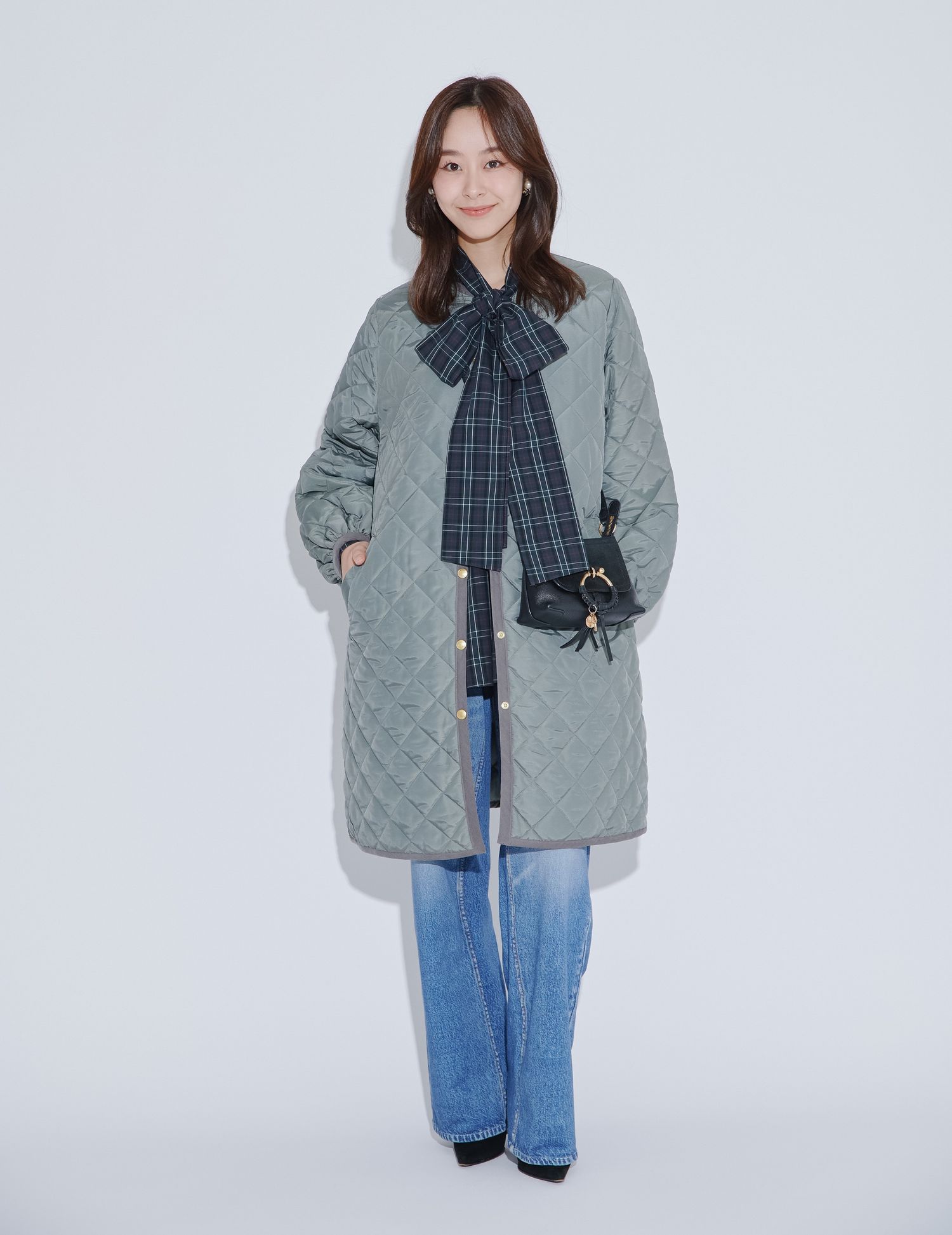 第5位は、グレイッシュグリーンのキルティングコートから、存在感のあるチェック柄のボウタイブラウスを覗かせた旬なカジュアルコーデ。縦に落ちるリボンディテールが視線を自然と引き上げ、顔回りを華やかに。ボトムスは程よく色落ちしたストレートデニムで上品なカジュアルさを添えつつ、ブラックのパンプスやミニバッグで全体をきりっと引き締めて。甘さ・カジュアルさ・上品さのバランスが絶妙に整った、大人にちょうどいいデイリースタイルです。