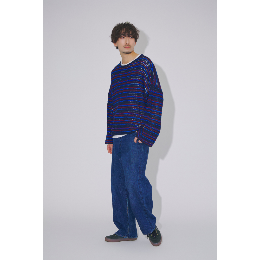 存在感のあるマルチボーダーニットにワイドデニムを合わせた、春のリラックスカジュアル。ブルーを基調としたカラーリングが春らしく、ニットからさりげなく白のインナーが抜け感を演出してくれます。足元はレザースニーカーで軽快にまとめれば、ラフになりすぎず大人らしいバランスに。