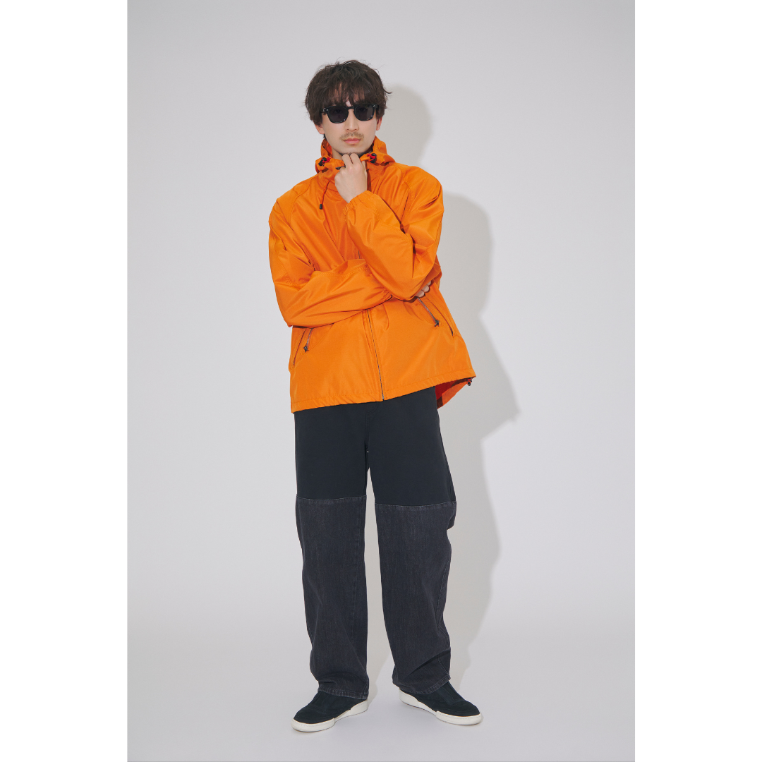 旅行コーデでは、動きやすさと温度調整のしやすさが最優先。移動時間が長くなったり、朝晩の寒暖差があったりするため、軽量アウターが活躍します。ビビッドなオレンジが目を惹くザ・ノース・フェイス パープルレーベル(THE NORTH FACE PURPLE LABEL)のマウンテンパーカーは、機能性と存在感を兼ね備えた1着。撥水性や防風性のある素材なら、天候が変わりやすい春の旅先でも安心です。ボトムスは切り替えデザインが特徴のブラックデニムを合わせて、トップスを引き立たせながら、動きやすさも両立。