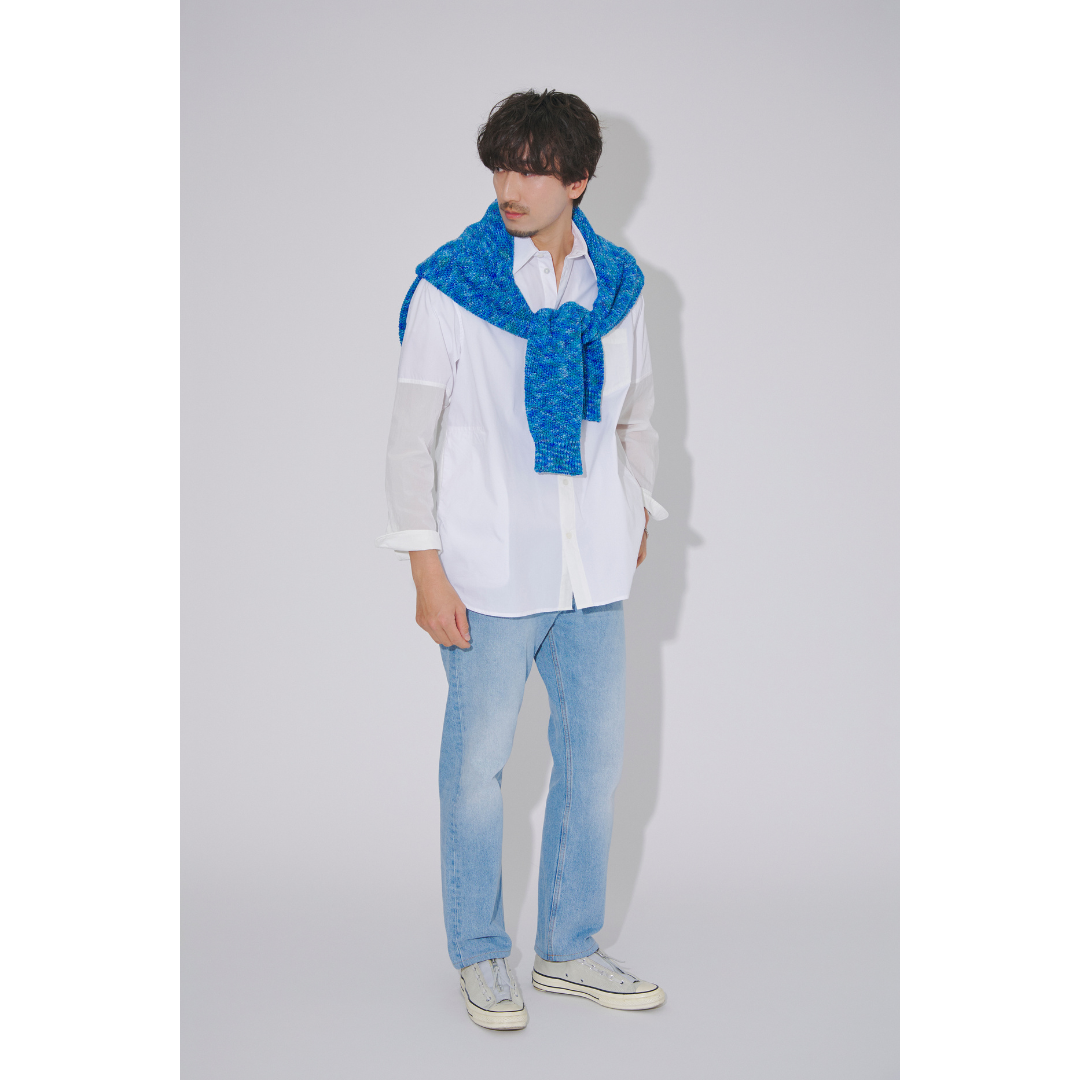 無理に若作りをせず、素材や色使いで軽やかさを演出するのが50代の春コーデをつくるポイント。今回は、定番の白シャツにデニムを合わせた、春らしい爽やかなスタイルを提案。小物感覚で取り入れたブルーのニットを肩掛けすれば、コーディネートに程よいアクセントが加わります。シンプルな色使いでも着こなしで差をつければ、大人の余裕を感じるスタイルが完成します。
