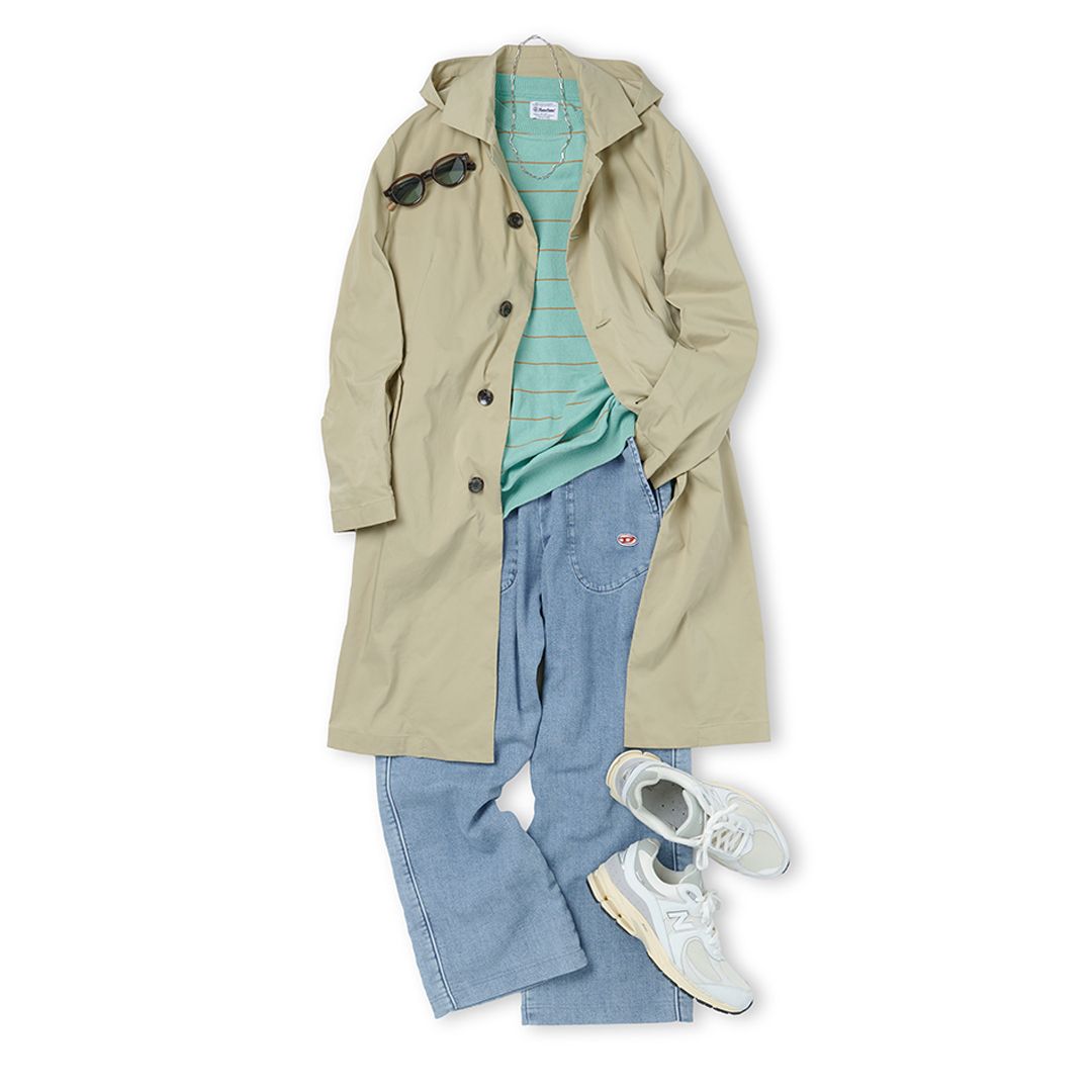1つ目は、春の王道アウター「ステンカラーコート」。シンプルで癖のないデザインは、スーツにもカジュアルにも合わせやすく、通勤から休日まで幅広く活躍します。カラーはベージュやネイビーが定番。特にベージュは春らしい軽やかさがあり、どんなインナーとも合わせやすいのが魅力です。