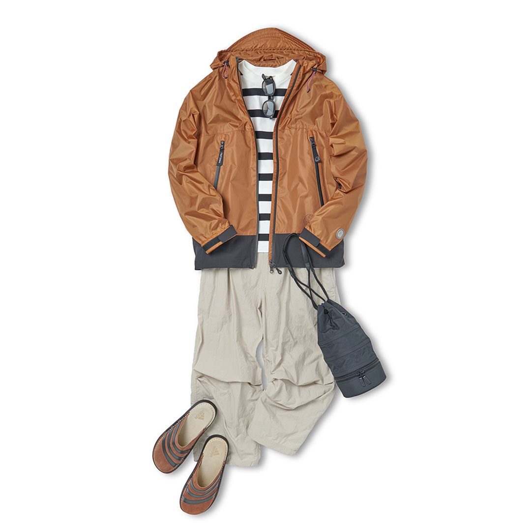 4月になると気温は一気に上昇し、日中は18〜20度程度の過ごしやすい陽気になる日が増えます。ただし朝晩はまだ10度前後まで冷え込むこともあり、アウターを手放すのは少し早い時期です。この時期は、脱ぎ着や持ち運びしやすい「軽アウター」を取り入れた着こなしが正解。今回は、薄手でさっと羽織りやすいナイロンジャケットに、ベージュの軽量パンツを合わせたアクティブなスタイル。インナーにはボーダーカットソーを合わせて、アクセントと程よい抜け感をプラスしました。