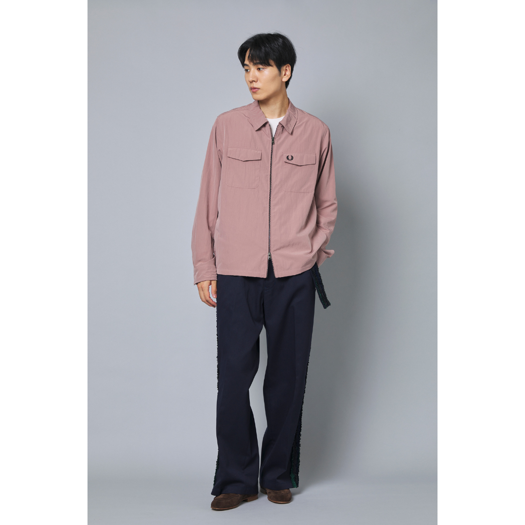 お花見シーンは屋外で長時間過ごすことが多いため、動きやすさと春らしさの両立がポイント。寒暖差にも対応できるアイテムが活躍します。フレッドペリー(FRED PERRY)のくすみピンクのシャツブルゾンは、さらっと軽快に羽織れ、見た目にも春らしい1着です。ボトムスはブラックのパンツで引き締め、甘くなりすぎないバランスに。