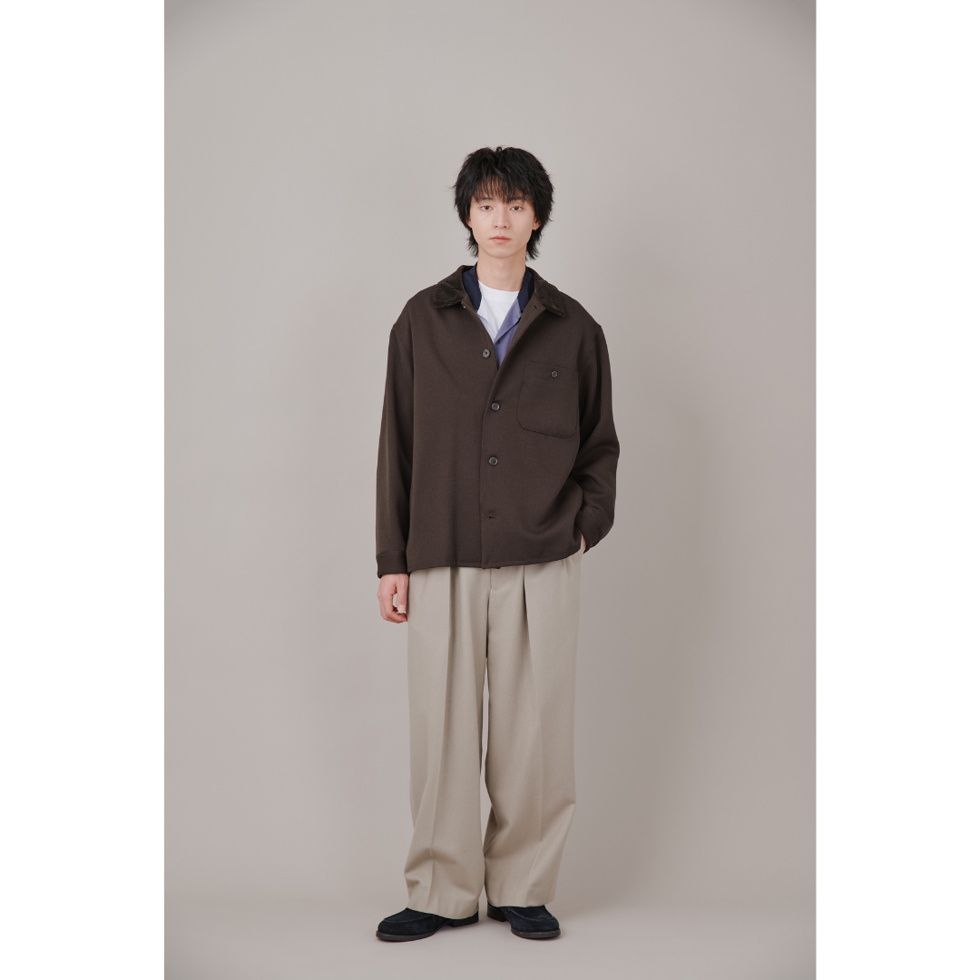 きれいめ派の方におすすめの大人の春スタイル。今回使用したマーカウエア(MARKAWARE)のブラウンの軽アウターは、春でも取り入れやすいやわらかなダークトーン。黒ほど重たく見えず、大人らしい余裕を演出できます。インナーには白Tシャツとバイカラーシャツをレイヤードし、奥行きをプラス。ボトムスは同系色のベージュのワイドスラックスを取り入れて、季節感のあるワントーンな着こなしに。