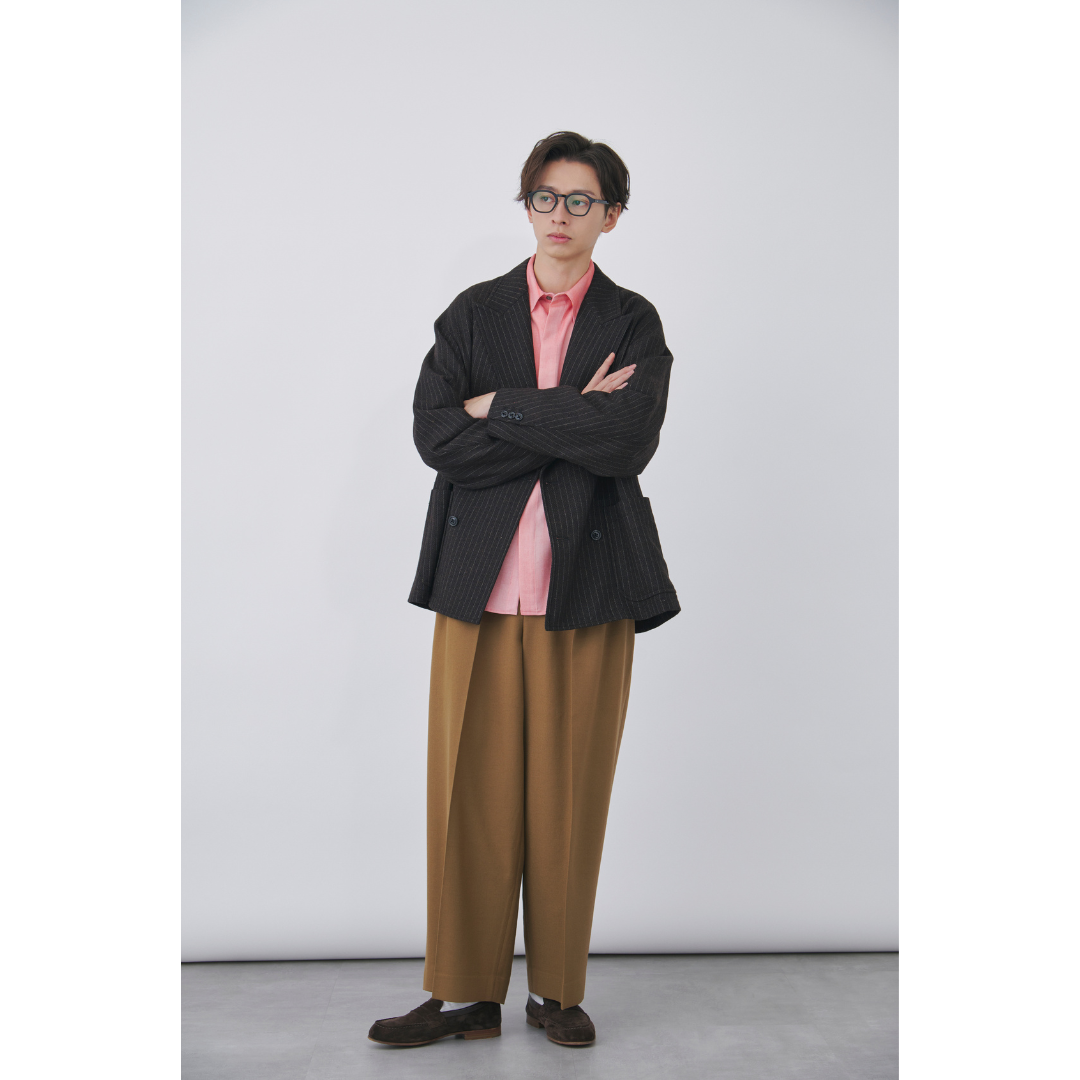 春のデートコーデで大切なのは、清潔感をベースに“ほんの少しの華やかさ”を加えること。ダークブラウンのストライプジャケットに、春らしいピンクのシャツを合わせたスタイルは、上品さと季節感を両立。一見ハードルが高そうに見えるピンクも、くすみのあるトーンを選べば大人でも取り入れやすく、顔まわりを明るく見せてくれます。ボトムスにはトップスになじむキャメルのワイドパンツを合わせ、足元はブラウンシューズで引き締めて。