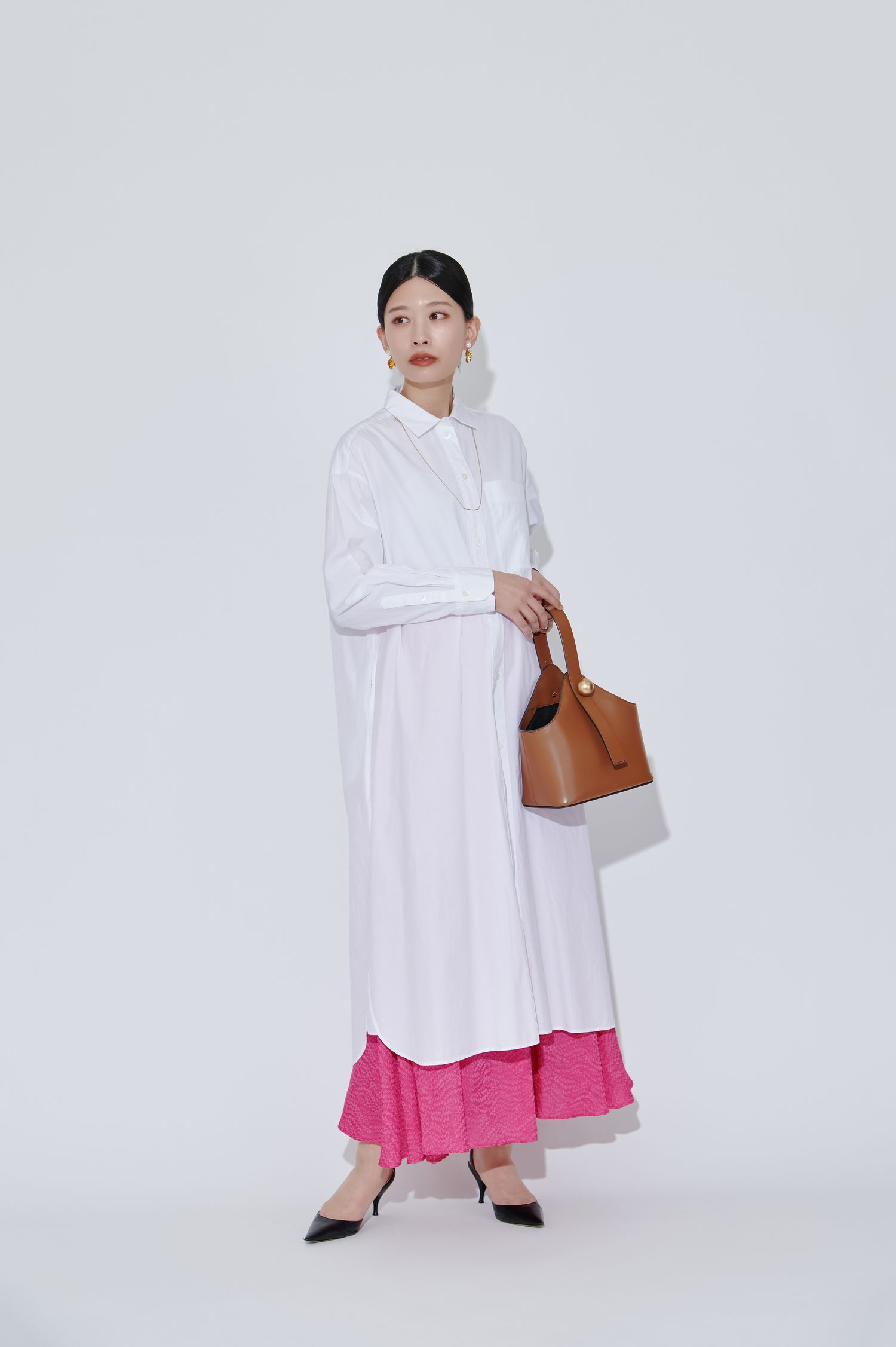 オンの日は、シャツワンピースに鮮やかなピンクのティアードスカートをレイヤードして、華やかさをプラス。クリーンなホワイトに差し色が映え、きちんと感のある着こなしにほどよいアクセントを添えてくれます。仕上げにレザーバッグとパンプスを合わせれば、オフィスにも馴染む上品コーデの完成です。