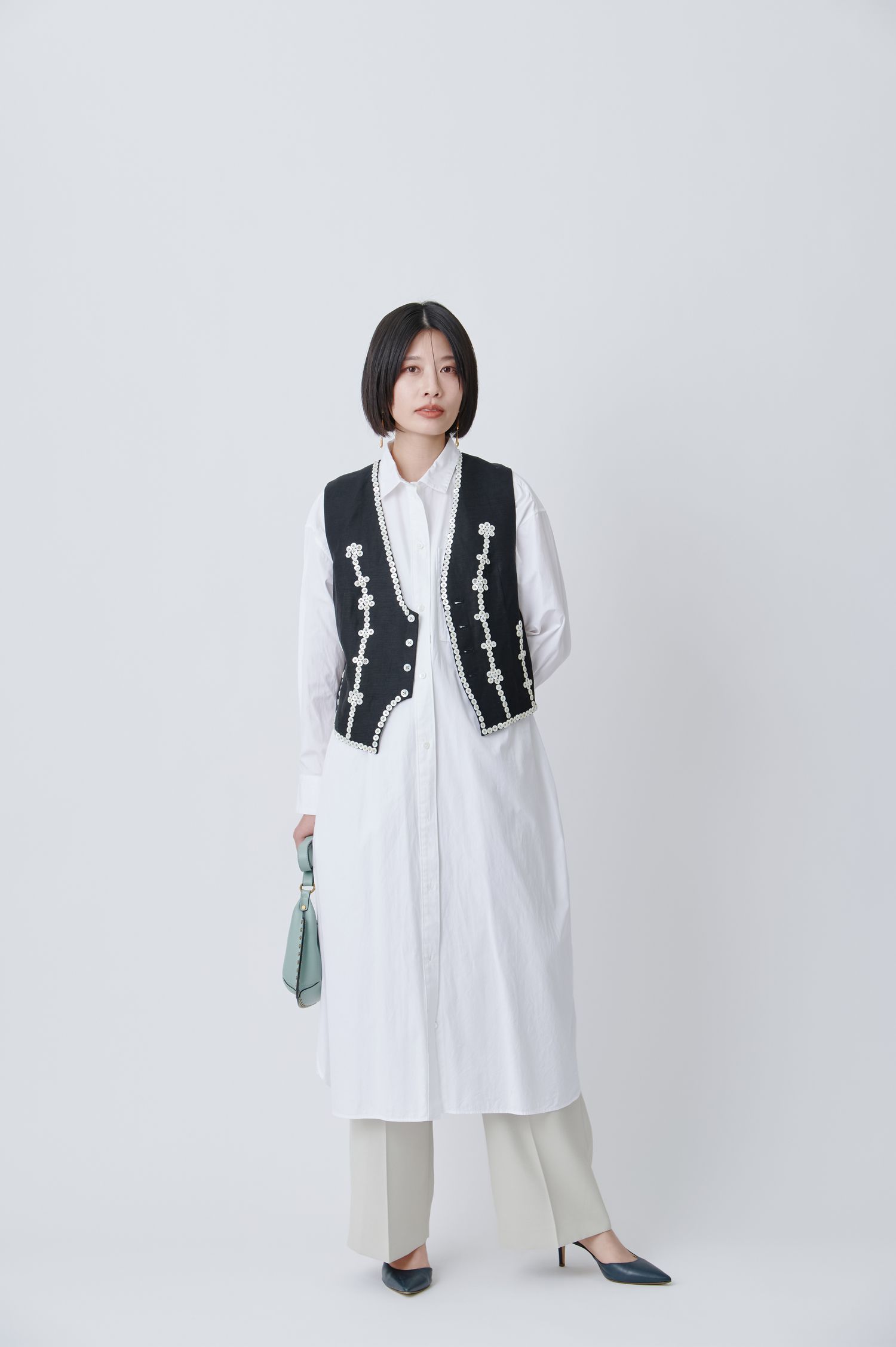 シャツワンピースにパンツをレイヤードしたリラックス感のある装い。ボタンの装飾が目を引くカレンテージ(CURRENTAGE)の黒ベストを重ねれば、メリハリが生まれ、ぐっとこなれた印象に。手元には爽やかなパステルグリーンのバッグを合わせて、抜け感のあるコーディネートを楽しんで。