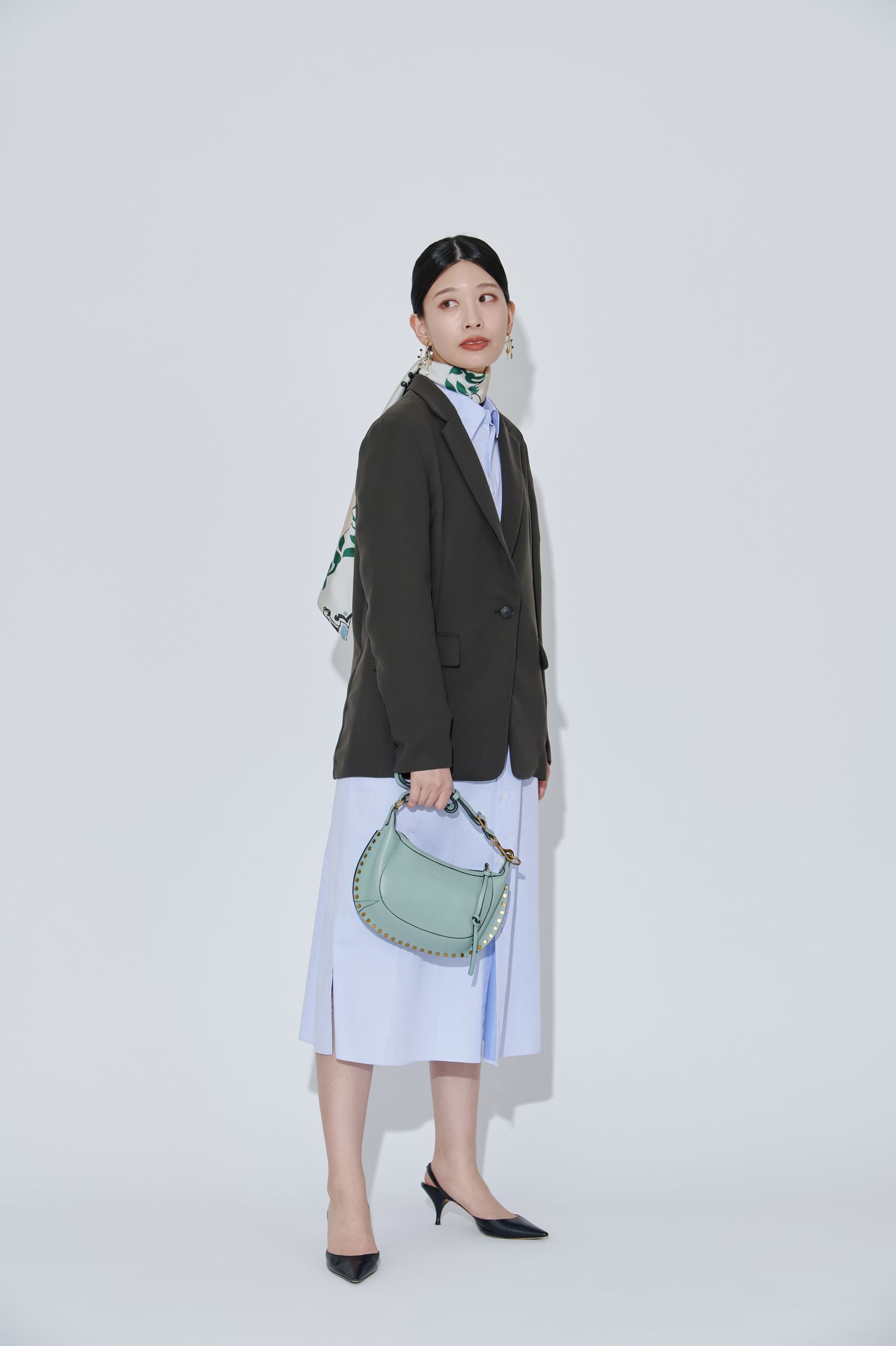 オンの日は、シャツワンピース×ジャケットできれいめコーデに。ブルーとブラウンの落ち着きのある配色が、きちんと感を引き立てます。首元にはダマスクプリントのスカーフを添え、知的な装いにさりげない華やぎをプラス。フリンジイヤリングやレザーバッグなど上品な小物を合わせれば、洗練されたオフィスカジュアルコーデが完成します。