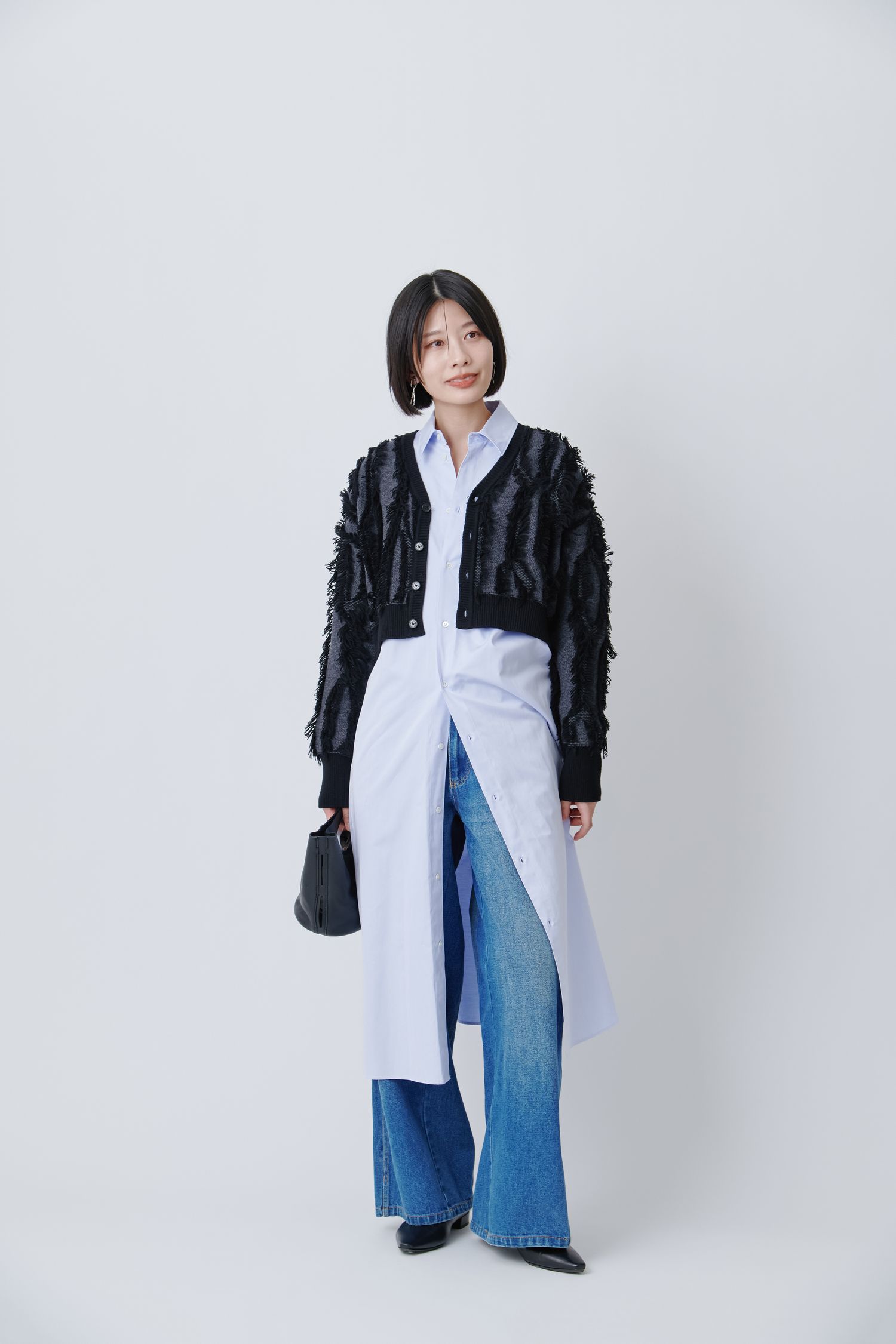 ワンピースの上には、表情豊かなフリンジデザインのカーディガンを羽織り、メリハリをプラス。クロップド丈なら視線が上がり、スタイルアップ効果も期待できます。
