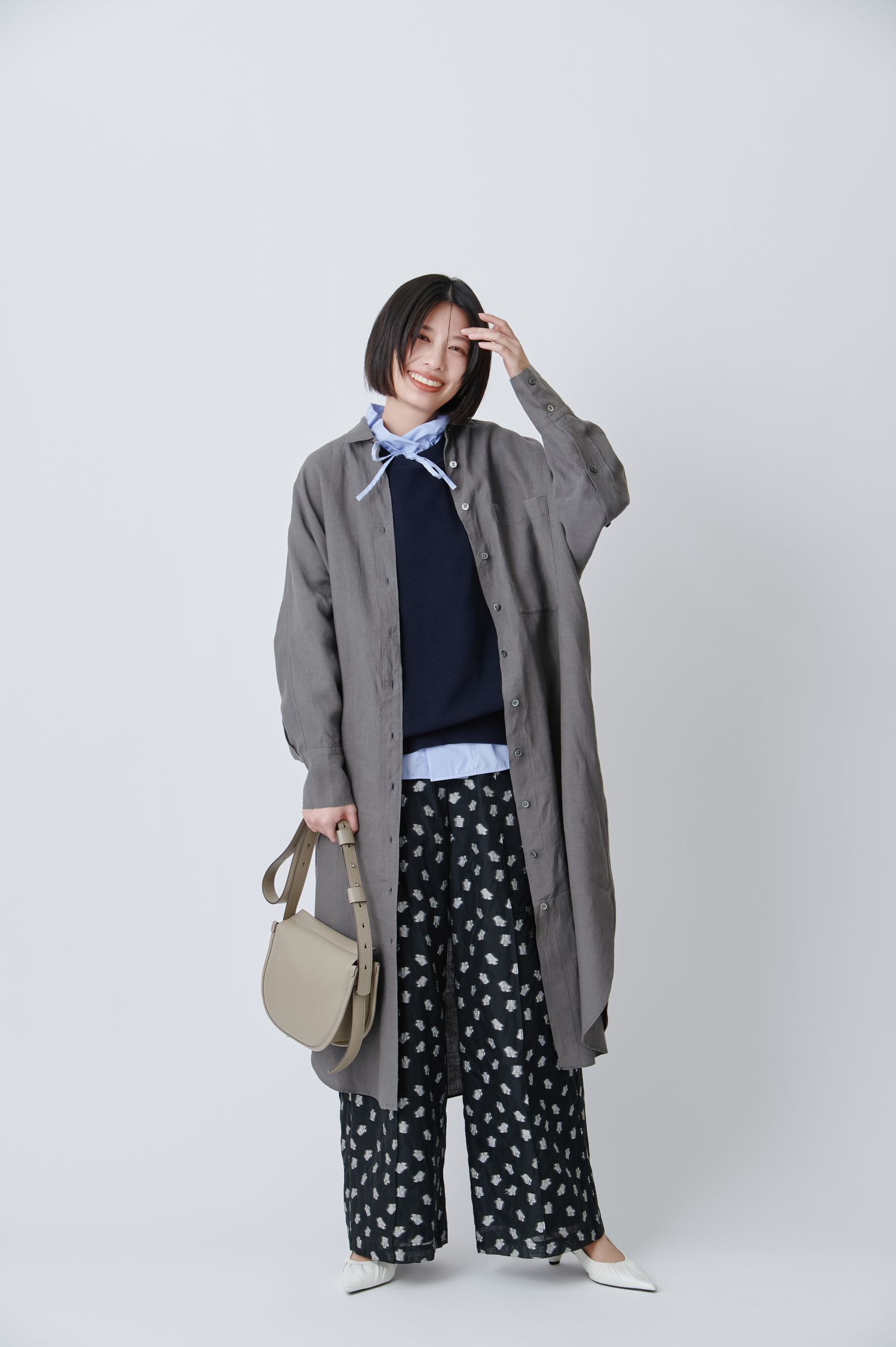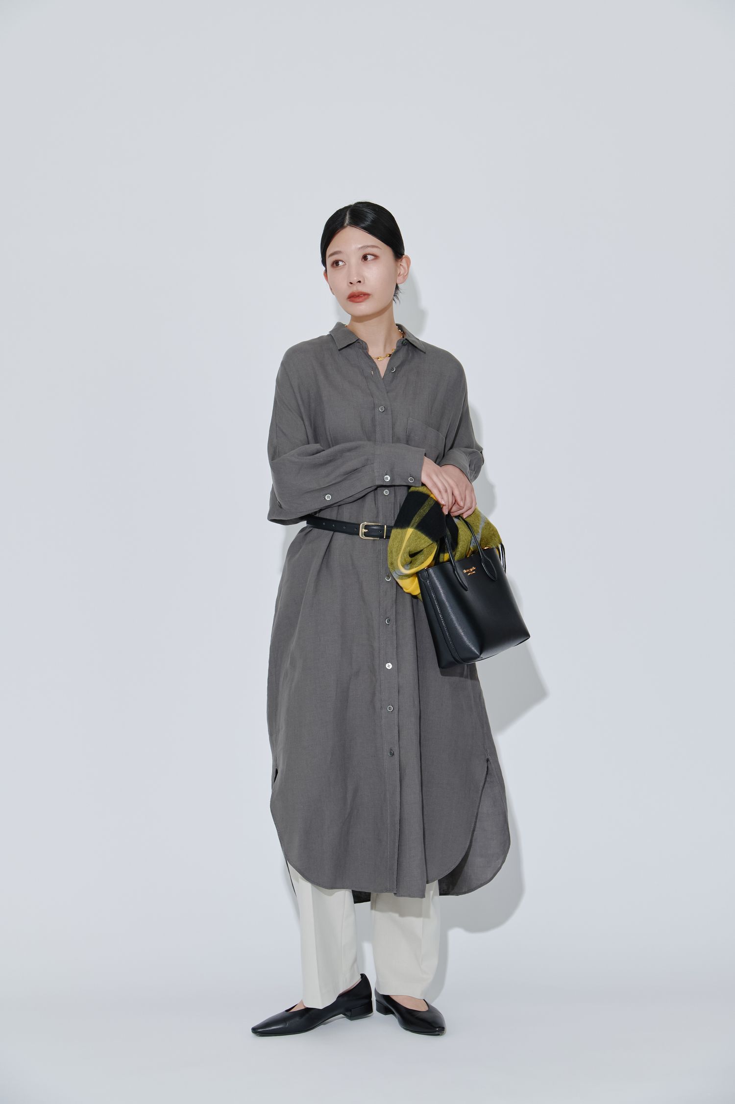 ラストは、ナチュラルなリネン素材と落ち着いたカラーが大人の余裕を感じさせる、サクラ(SACRA)のシャツワンピースを着回し。ゆったりとしたシルエットで、1枚で着るのはもちろん、羽織りとしても楽しめます。