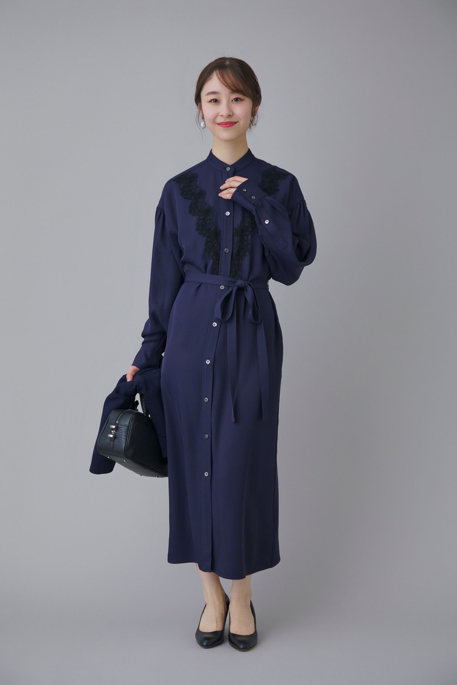 レースディテールとウエストリボンが女性らしいアクセントになった、デザインワークス(DESIGNWORKS)のシャツワンピース。落ち着いたネイビーの色味が、上品で知的な印象を与えます。ボクシーな黒バッグとパールが艶めくノーカラージャケットを合わせれば、通勤シーンにも馴染む大人のきれいめコーデに。